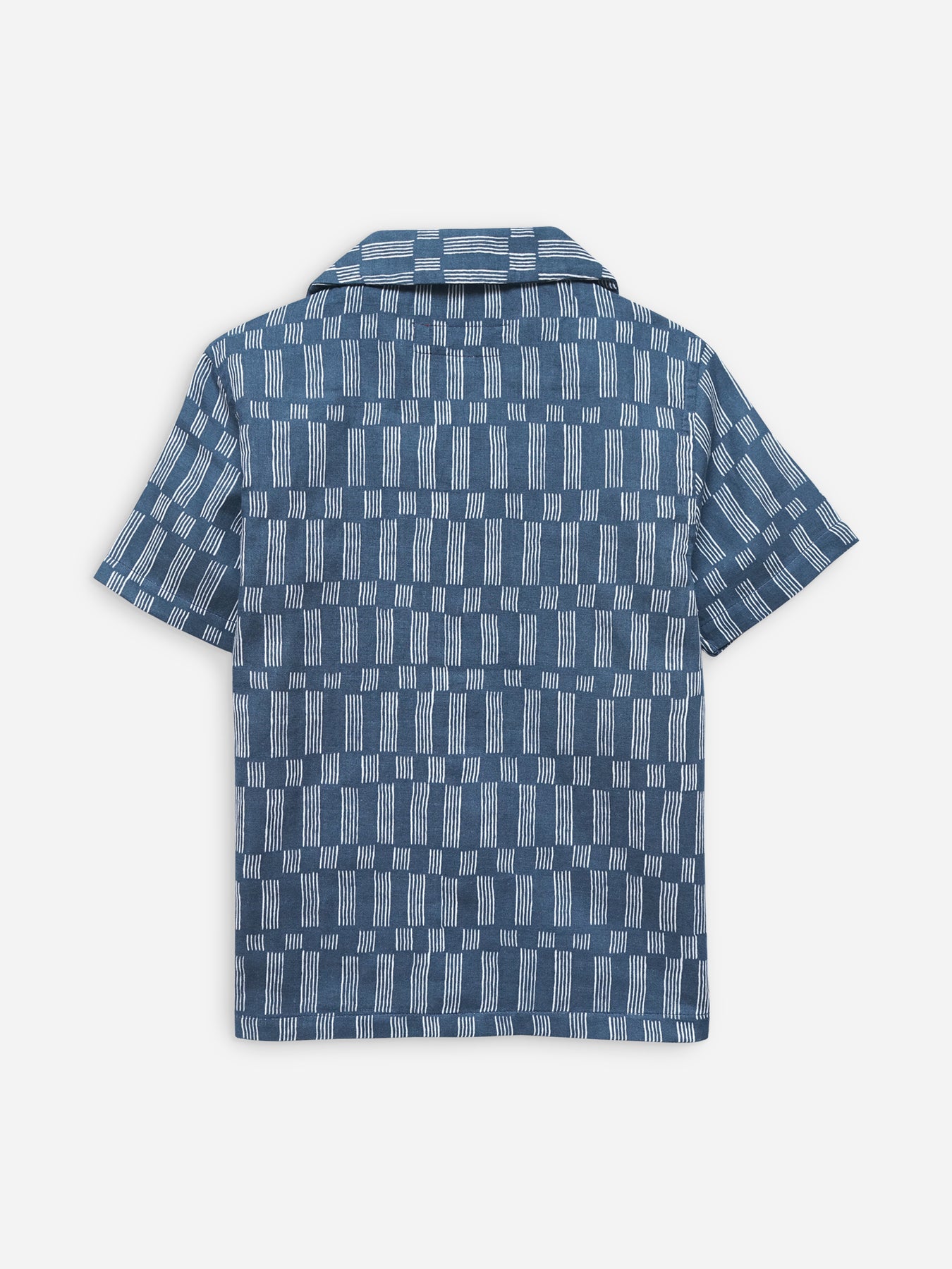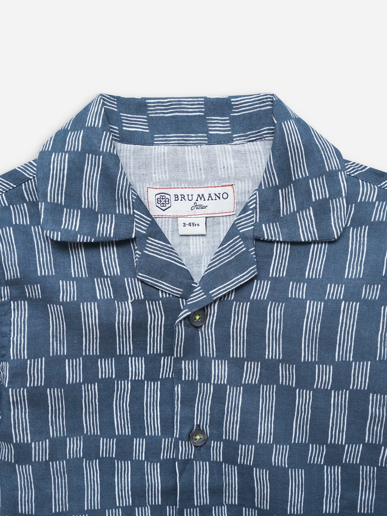 Let your child stand out in style with our kids' half sleeve printed shirt, featuring a cuban collar and subtle white print on blue bases. Perfect for summer days.