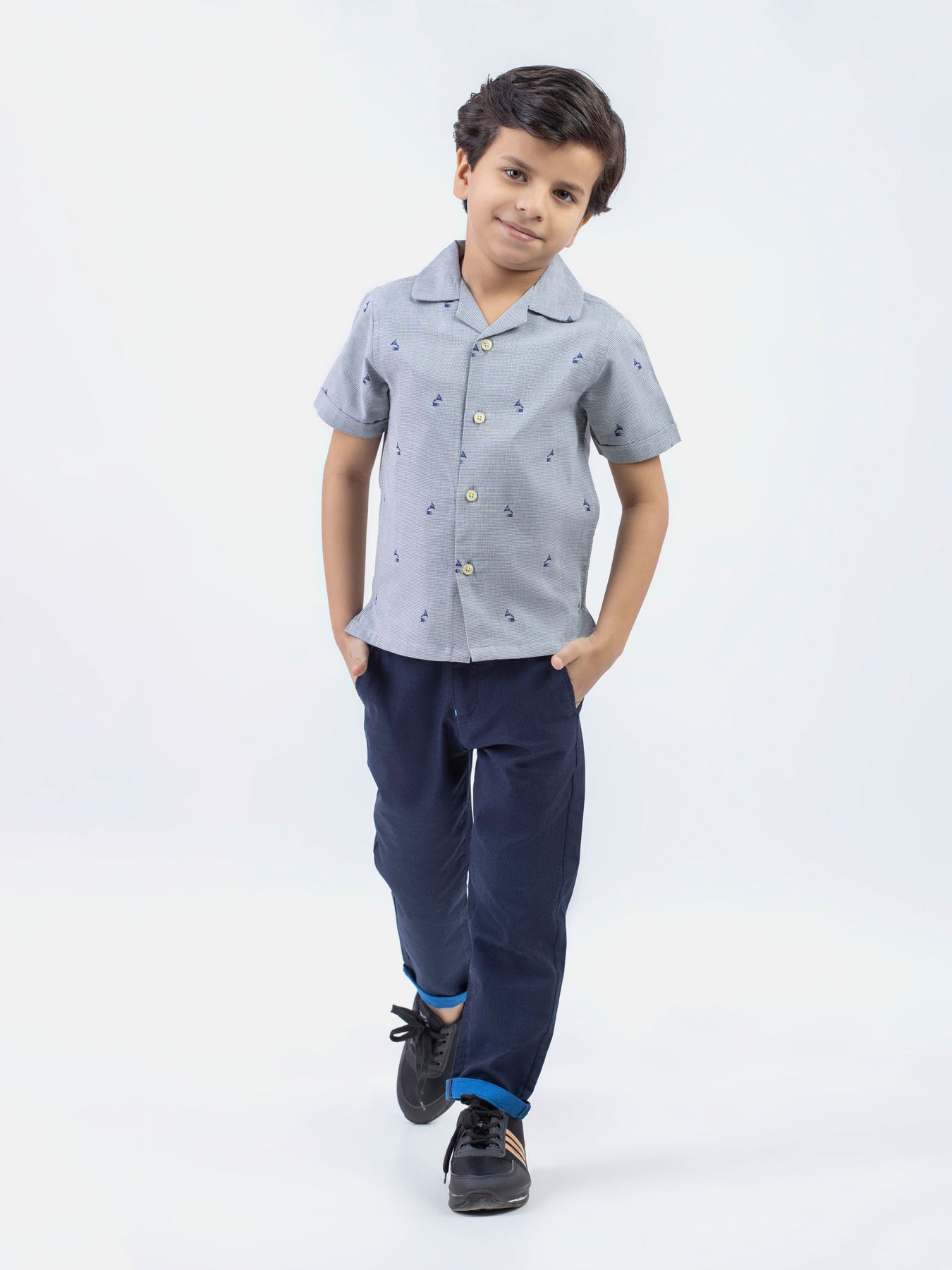 Stay cool and stylish with our kids' grey textured printed Cuban collar shirt, featuring half sleeves and a textured fabric that’s perfect for warm weather play and casual wear.