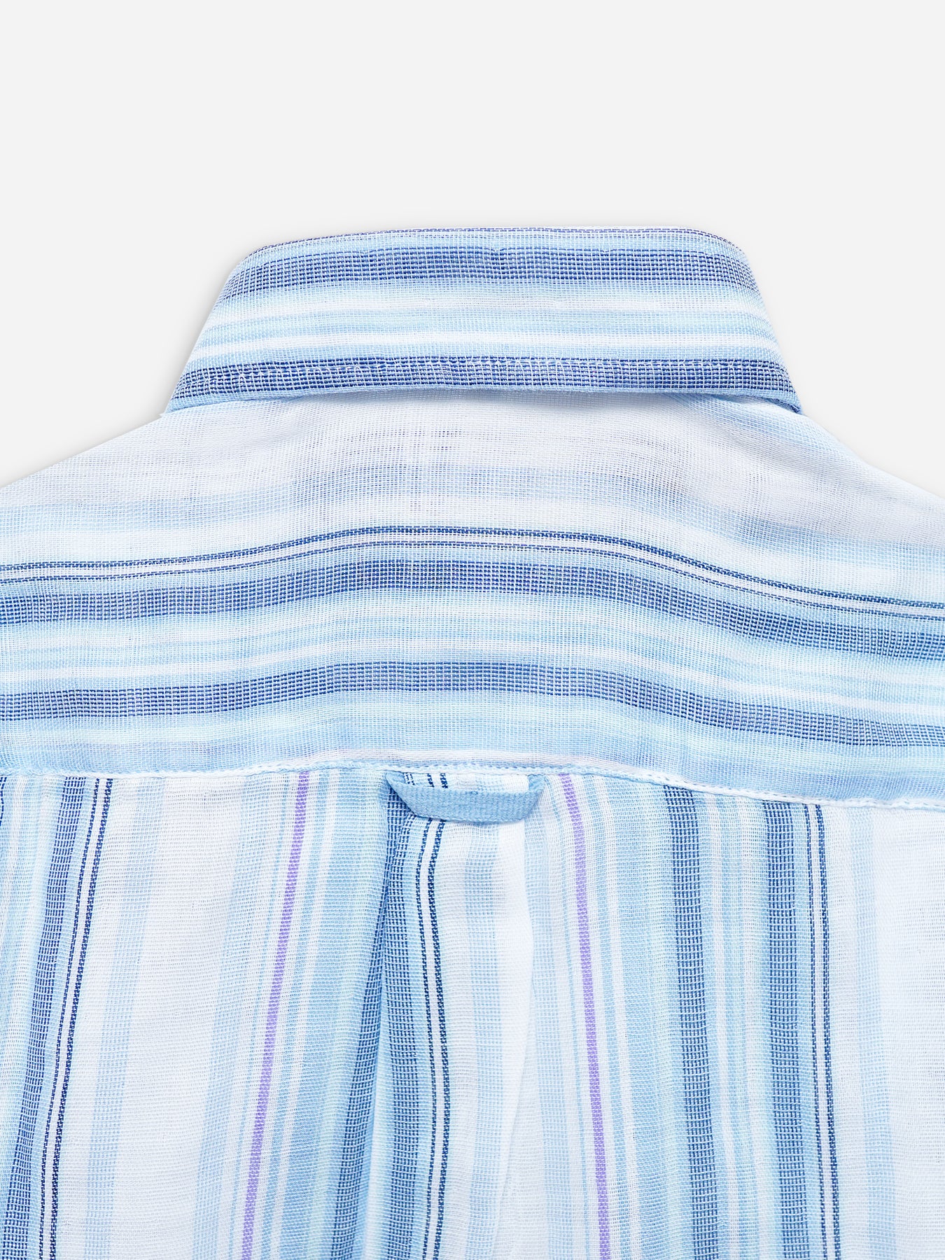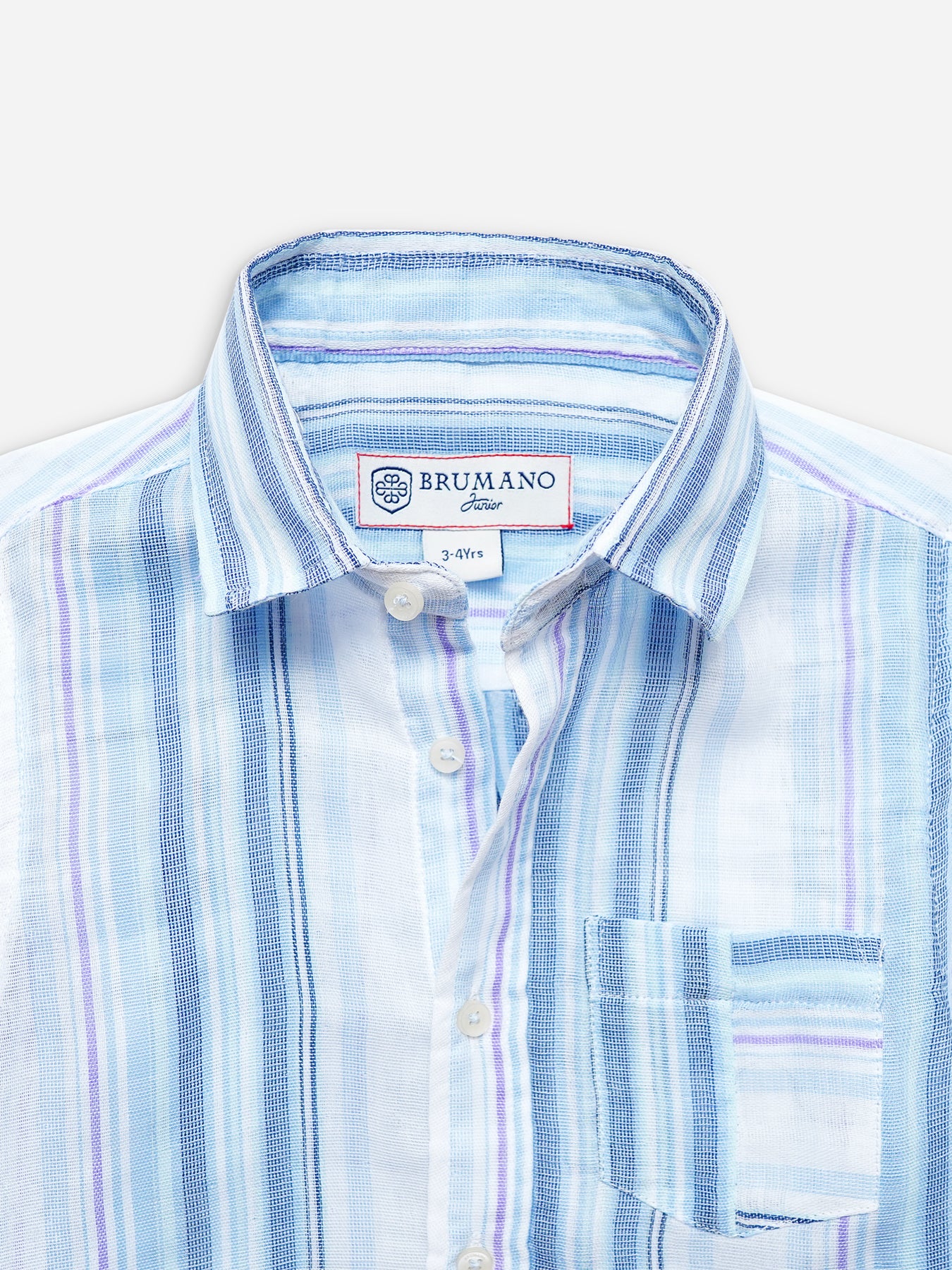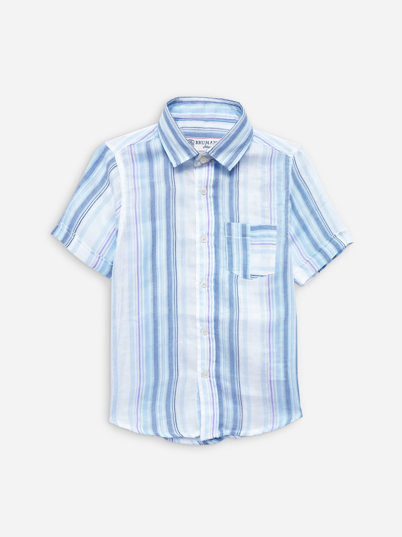 Get your little one ready for sunny adventures with our kids blue & white striped half sleeve casual shirt, a casual essential for summer playdates and outdoor fun. Made with light weight fabric, it features shallow collar, front pocket & short sleeves