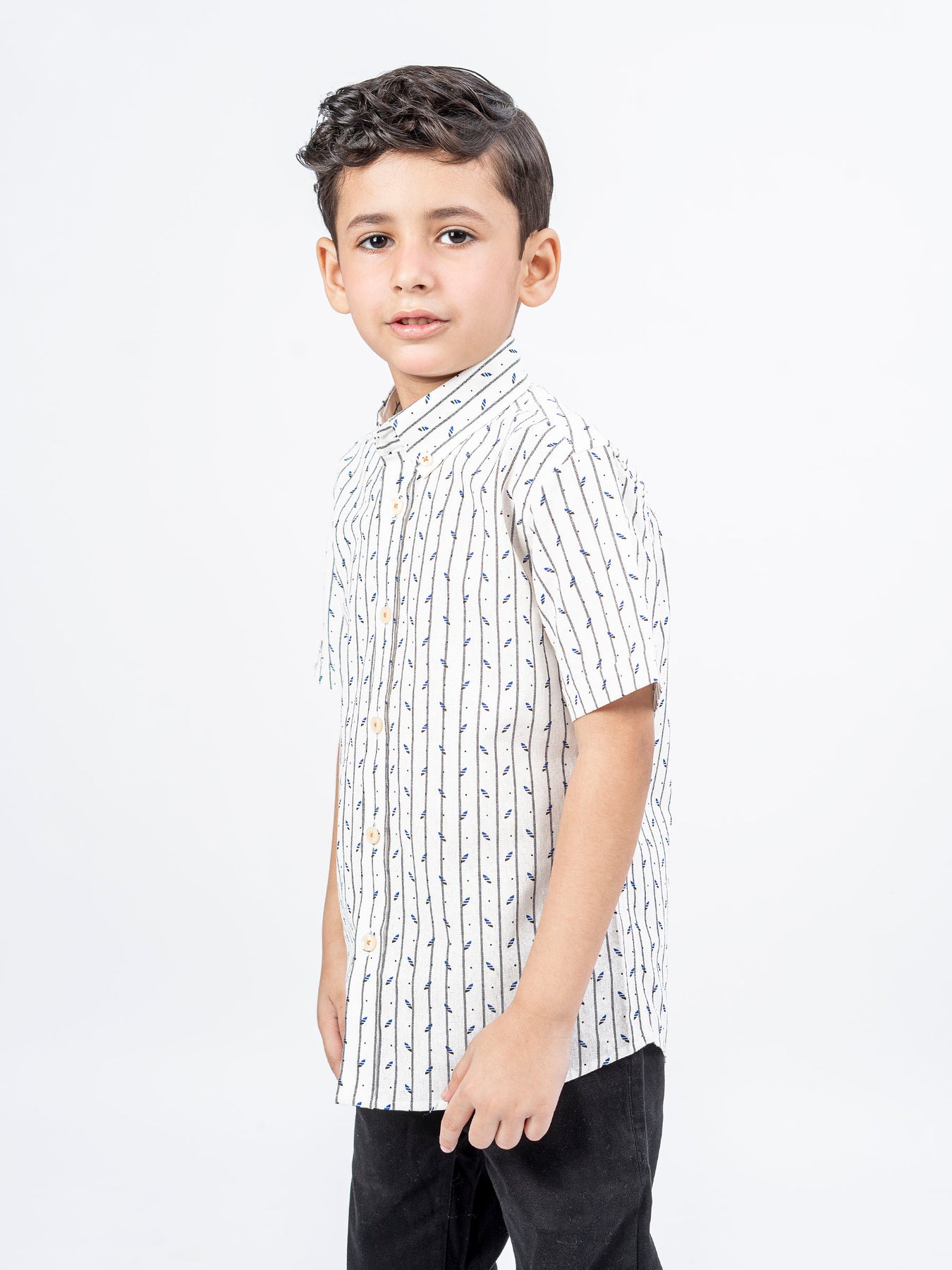 Keep your little one looking cool in this off white & black striped half sleeve casual shirt. Made from soft, breathable fabric, it ensures all-day comfort. Printed abstract patterns adds cool touch, perfect for outings, or casual wear.