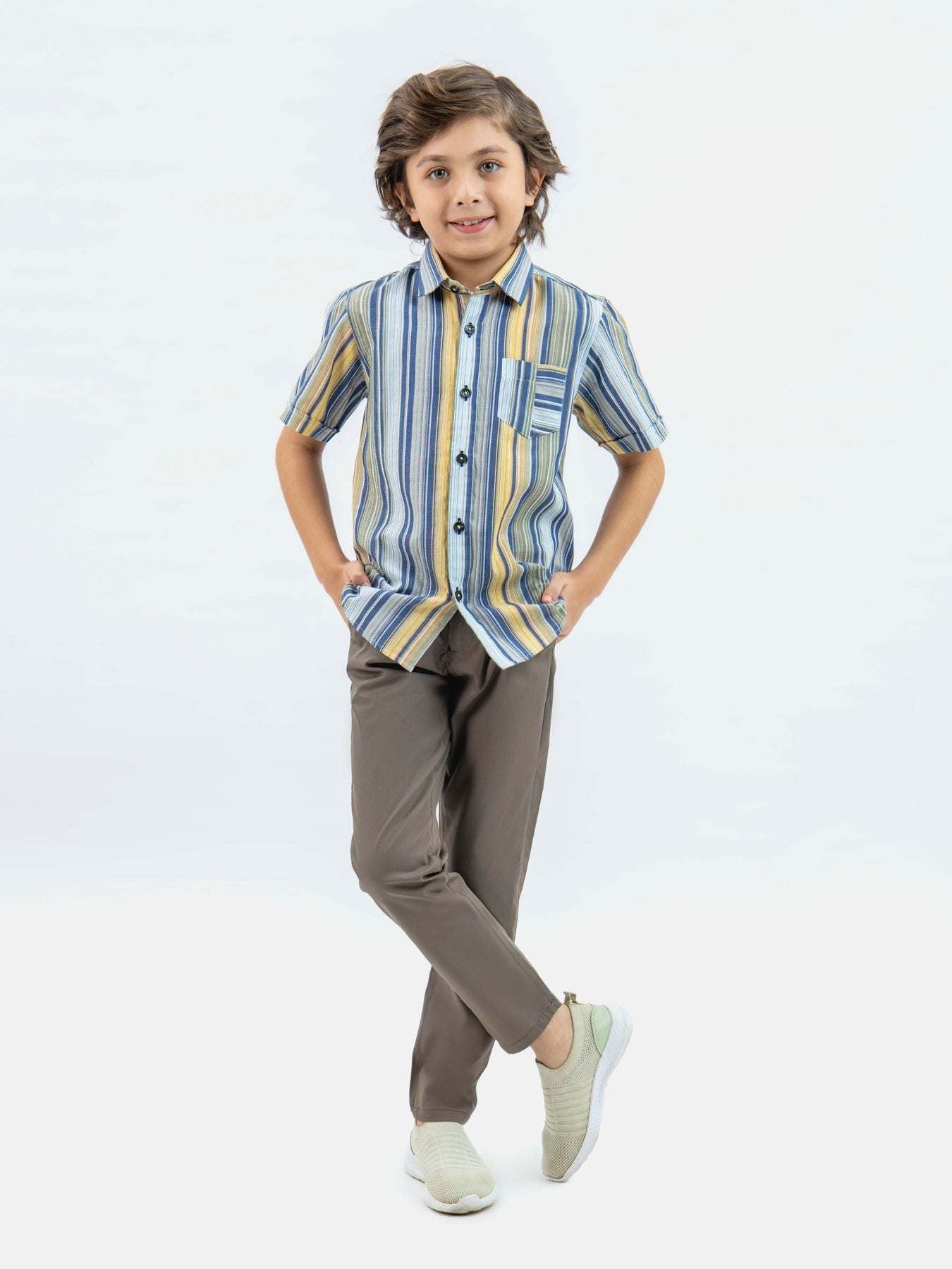 Get your little one ready for sunny adventures with our kids yellow & blue striped half sleeve casual shirt, a casual essential for summer playdates and outdoor fun. Made with light weight fabric, it features shallow collar, front pocket & short sleeves