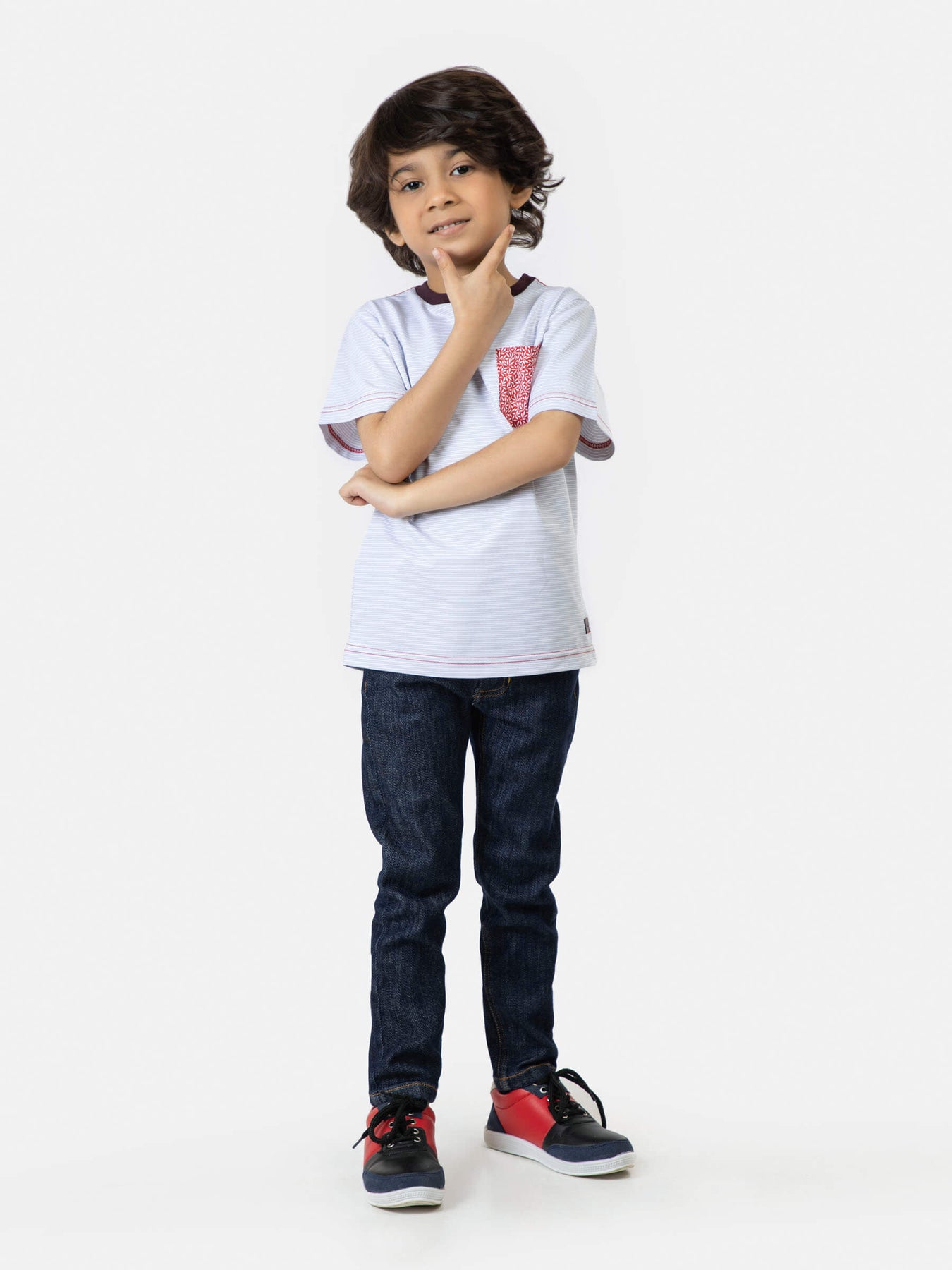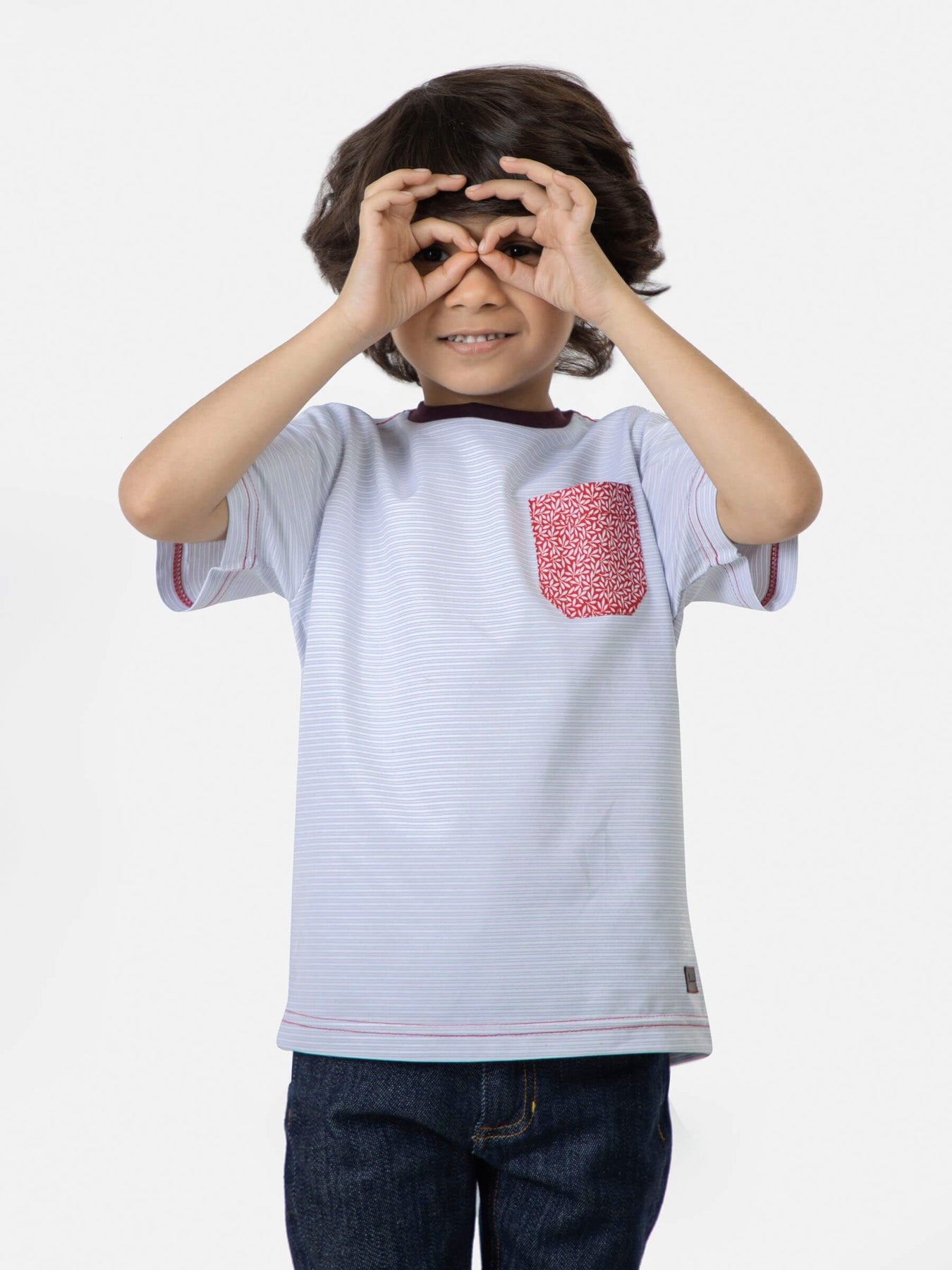 Kids love stripes, and this super soft striped casual t-shirt will be their favourite this season. With its allover striped design and soft material, this beautiful light grey tee is finished with black rib trim & contrasting front pocket. Made from premium quality material, it will last long even after repeated washings