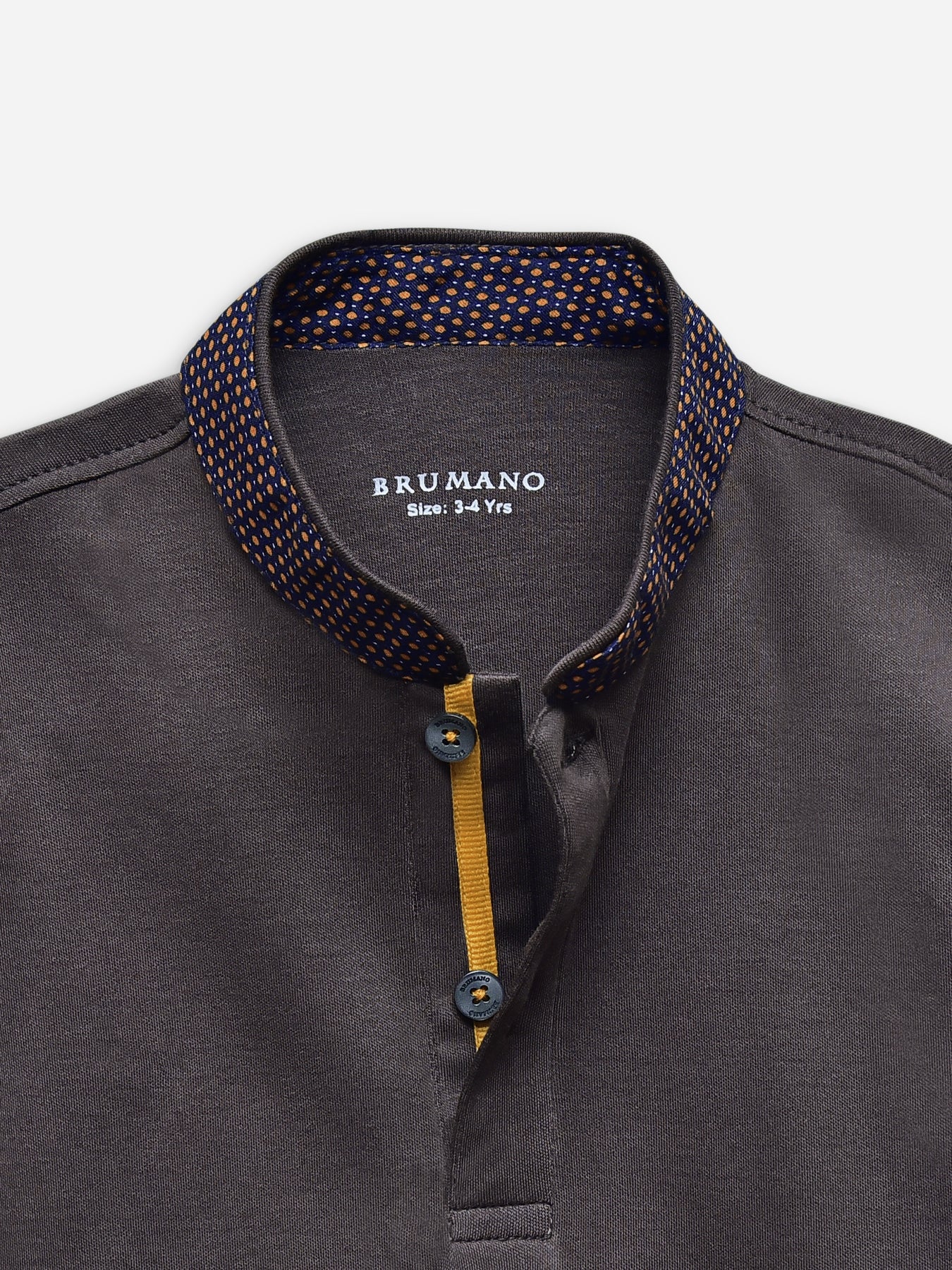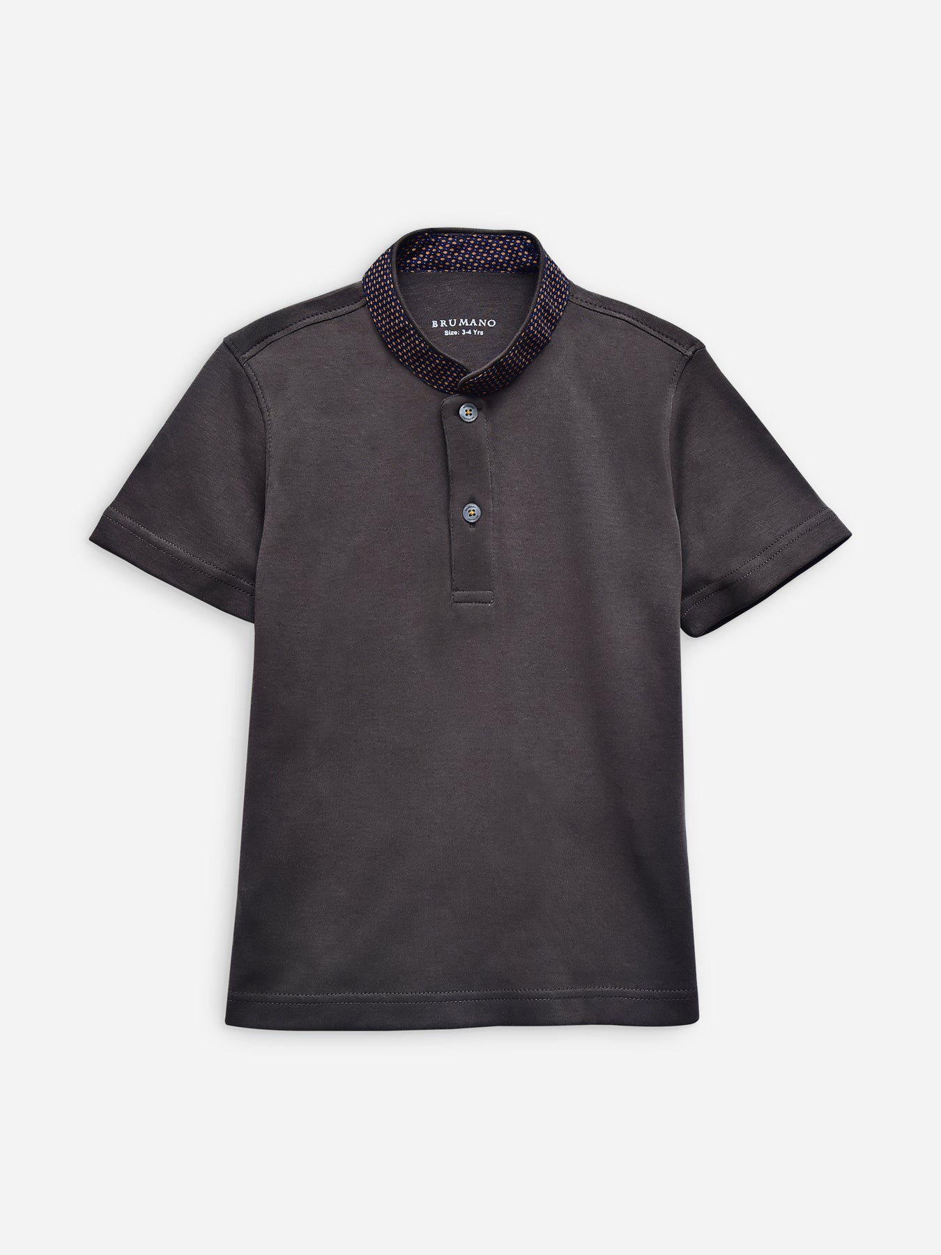 Introducing premium pima cotton polo shirt from Junior collection 2024. Made with interlock fabric, this kids brown polo features mao collar with printed detailing in super fine pima cotton. Short sleeves, two-button placket & side vents complete the look of this mandarin color polo