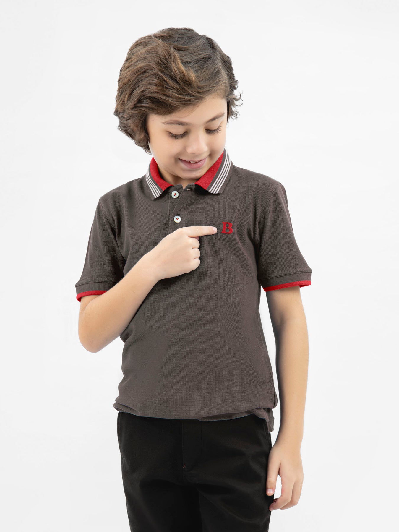 Keep your little one cool and comfortable in in our kids brown pique polo. Made with fine fabric, it features contrasting red collar, two button placket & branded 'B' emblem in front. Pair it with shorts for a summer look