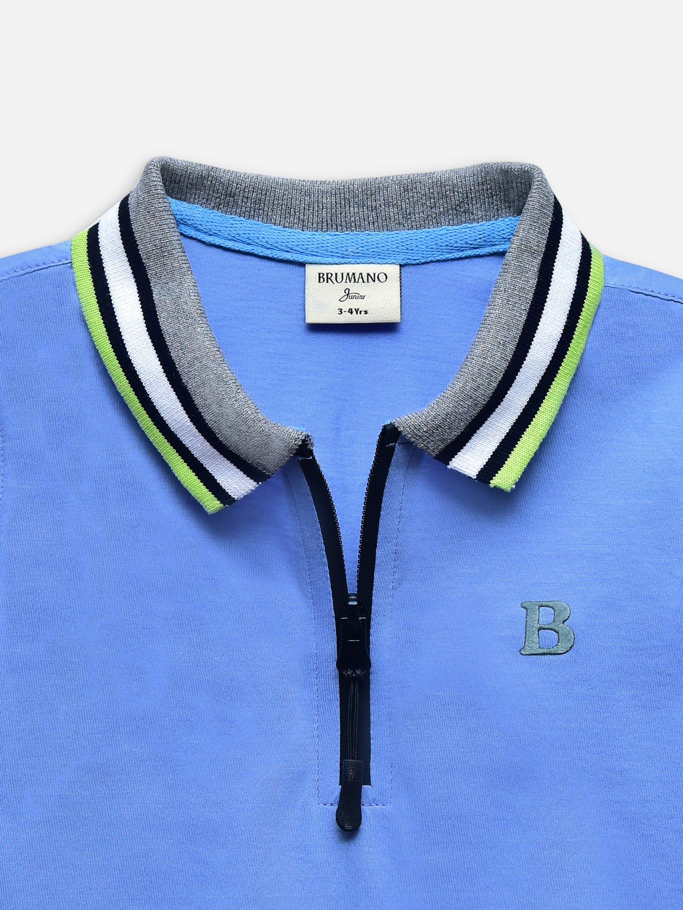 Mid Blue Interlock Zipper Polo With Contrasting Collar