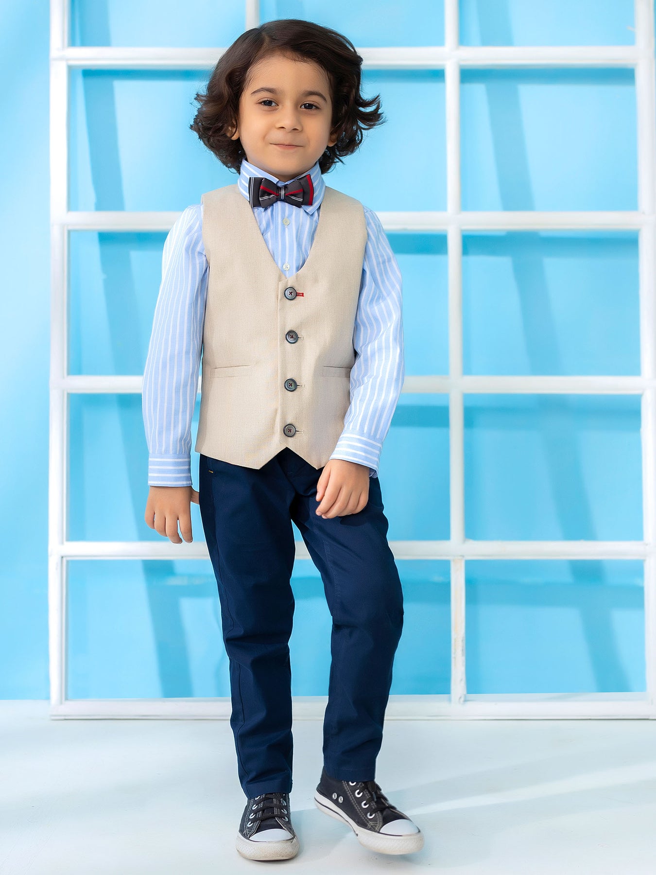 This kids beige linen vest with bow is perfect to dress up your little one for any special occasion. Beige textured linen fabric and playful bow will make them stand out from the crowd