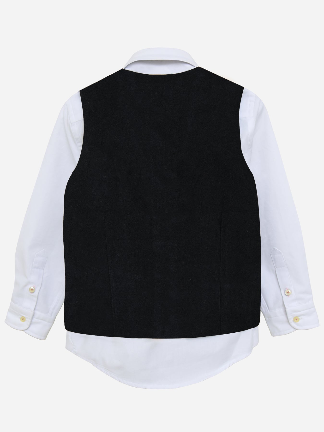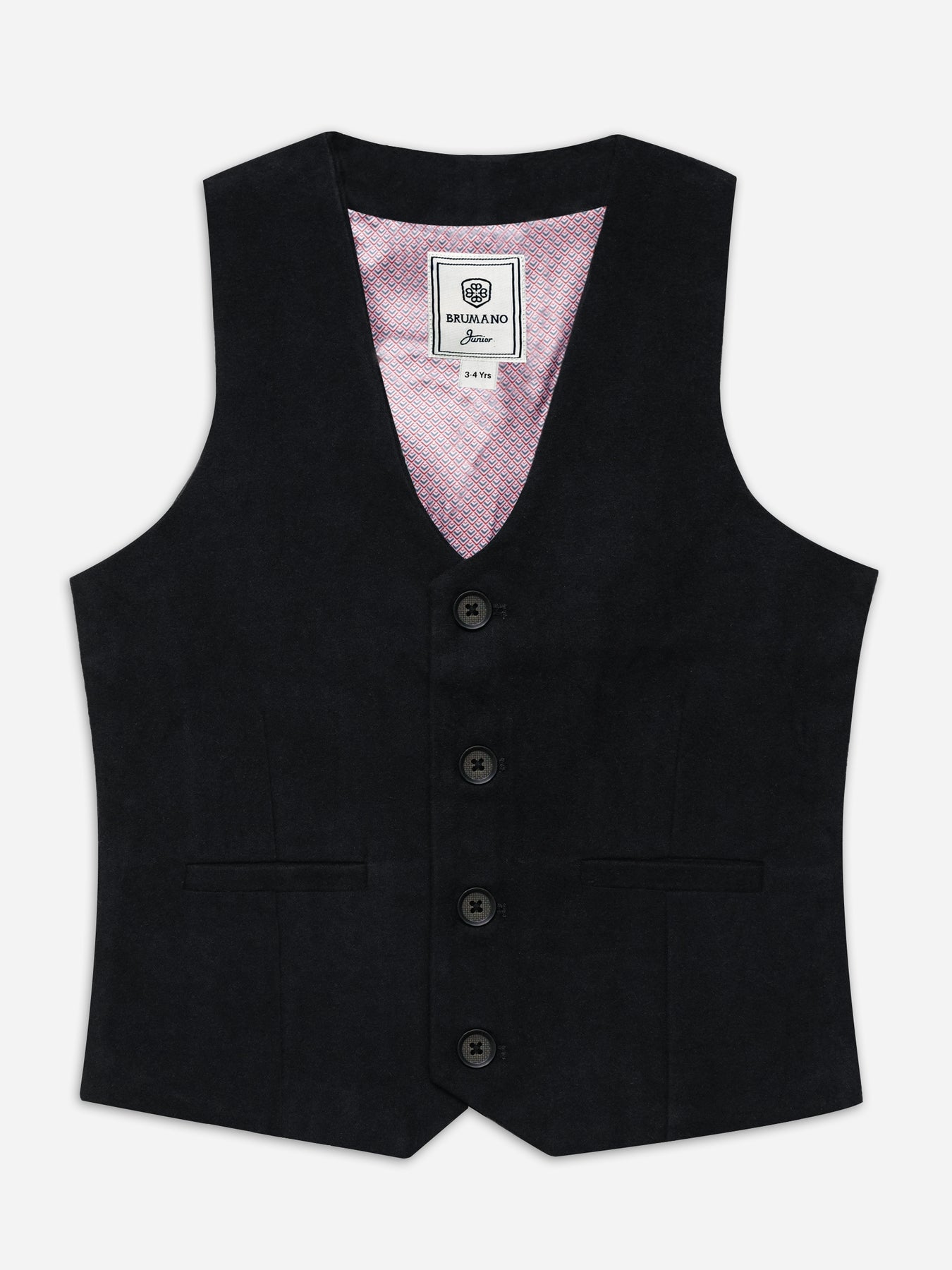 A refined black velvet vest designed for young gentlemen. Tailored with a soft, luxurious texture, it brings a touch of elegance to any occasion. Perfect for pairing with crisp shirt and dress trouser