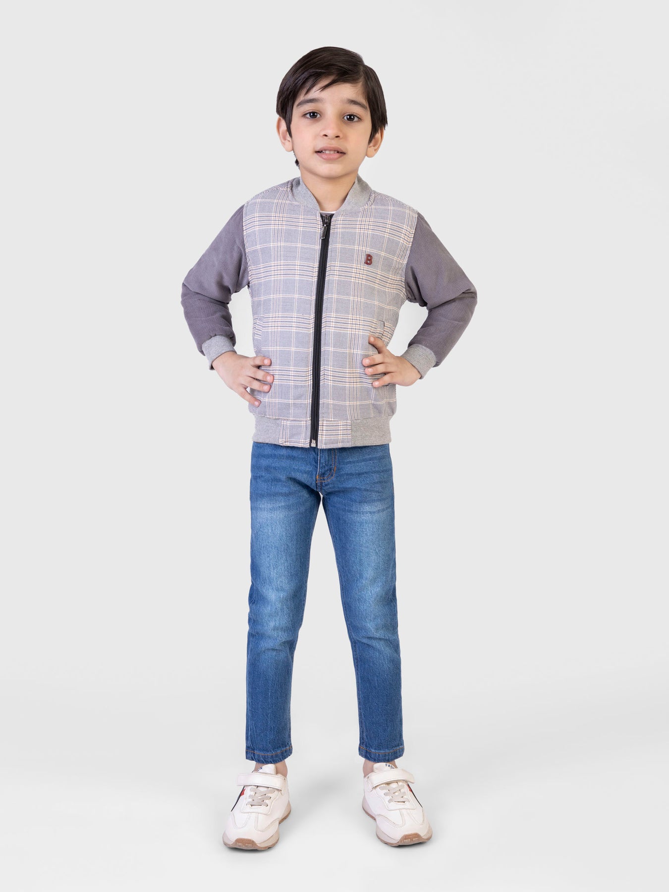 This kids' grey checkered jacket offers a cool look with contrasting grey corduroy sleeves, combining warmth and style for the cooler months. Front zip, bomber collar & ribbed hem & cuffs complete the look of this cool jacket for kids