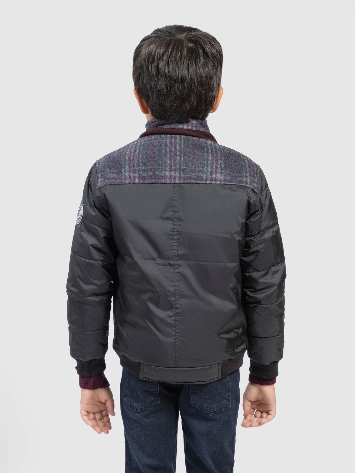 Infuse sophistication into your child's wardrobe with our purple & grey wool puffer jacket. Expertly crafted with wool blended fabric, it features mock neck collar with inner sherpa fleece, zip-up front & front patch pockets. Finished with metal emblem in front, this exclusive jacket is for modern kids
