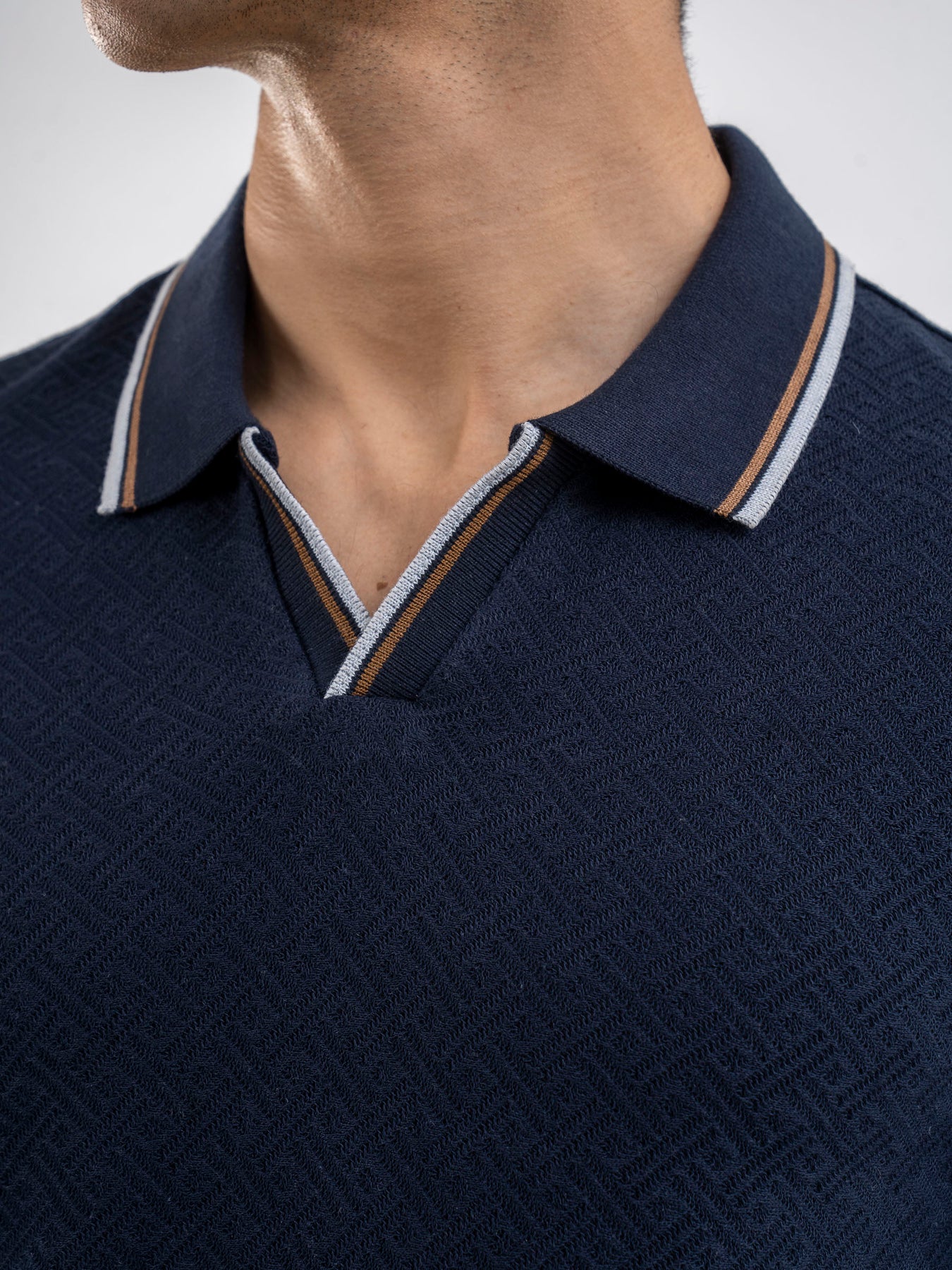 Elevate your casual style with this navy blue jacquard structured tipped v-neck polo. Featuring a refined jacquard texture, contrast tipping on the collar and sleeves, and a modern V-neck design, this polo blends comfort with a touch of polish—perfect for smart-casual days.