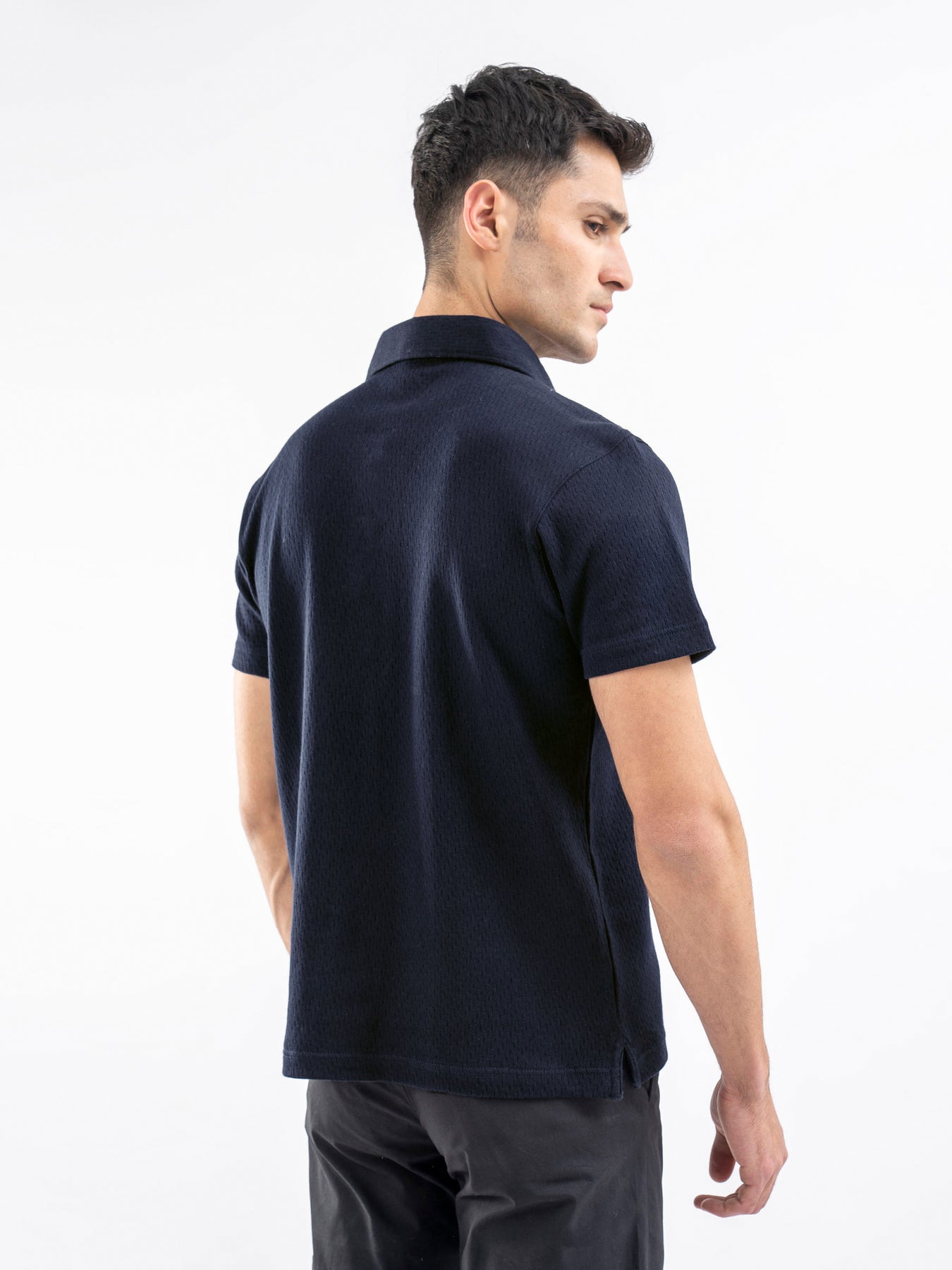 Elevate your smart-casual style with our navy blue structured polo. Crafted from premium textured fabric, it features a modern cutaway collar for a refined edge. Perfect for both work and weekend wear.