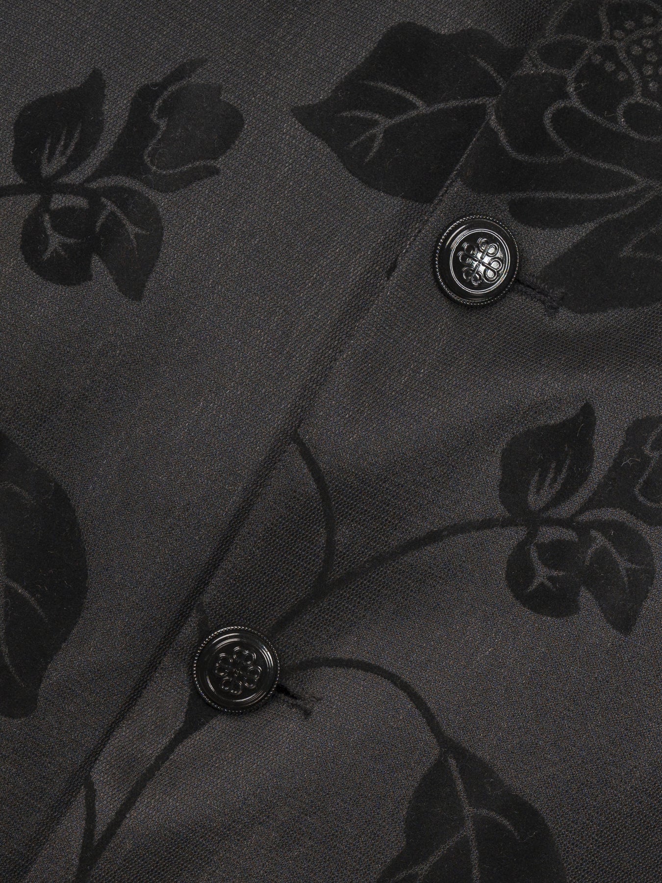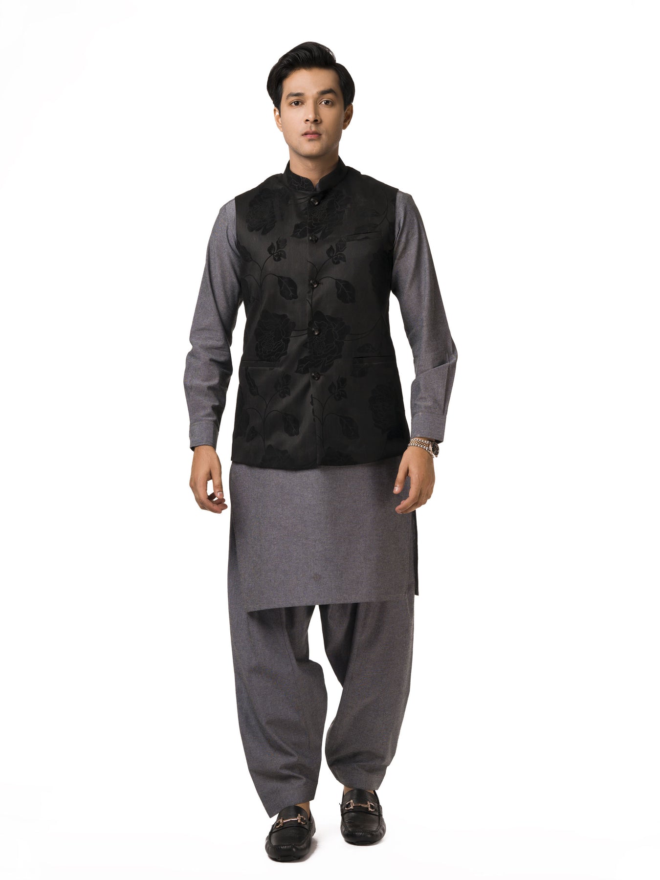 A bold floral pattern black waistcoat for that special look on event night. Perfect for special occasions, this black floral waistcoat is the way to go. Featuring metal buttons & sherwani collar