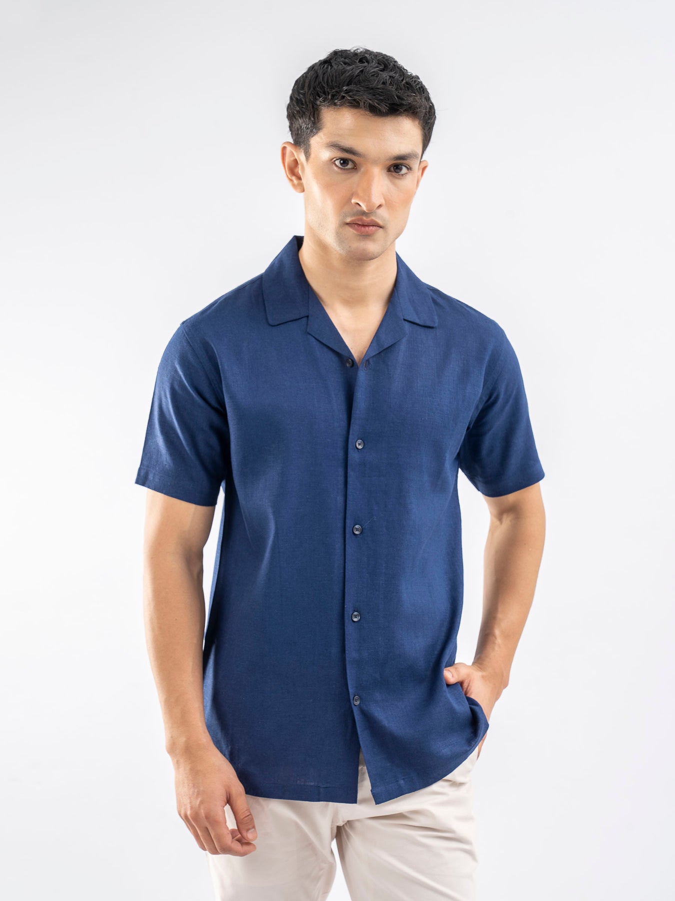 Blue Linen Blended Half Sleeve Cuban Collar Shirt