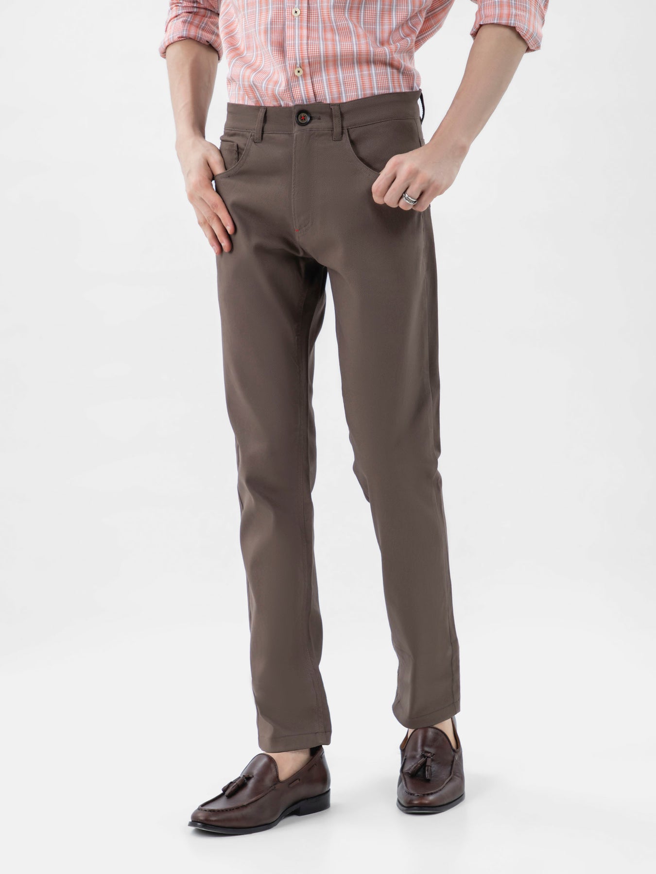 Experience comfort and style with our new brown dobby structured five pocket trousers. The dobby fabric adds a touch of texture and depth, while added stretch ensures comfortable fit & flexibility. Featuring branded navy blue leather patch at the back for modern look. Wear it with light blue shirt for a classic look
