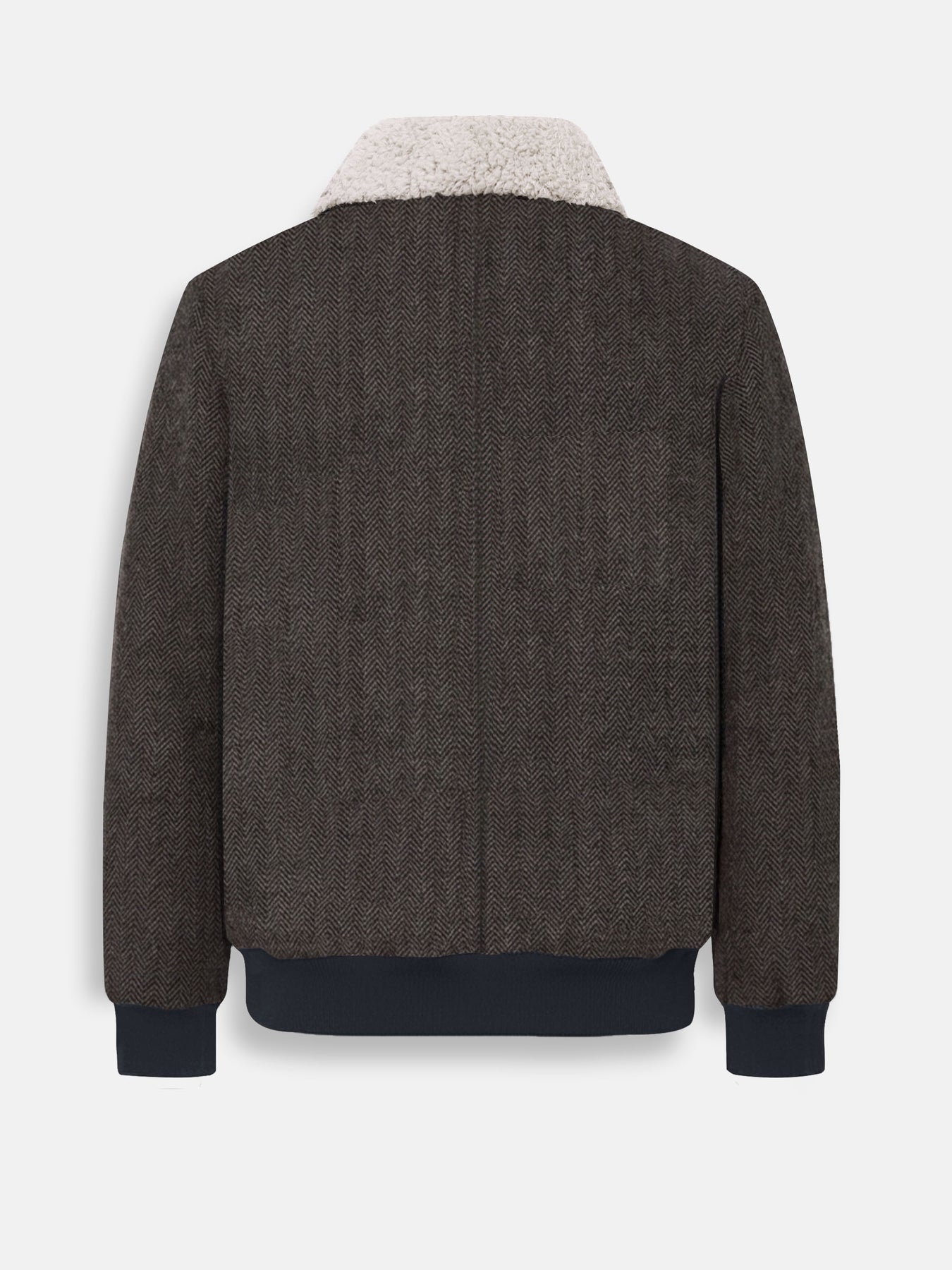 Brown Wool Blended Aviator Jacket With Beige Sherpa Collar