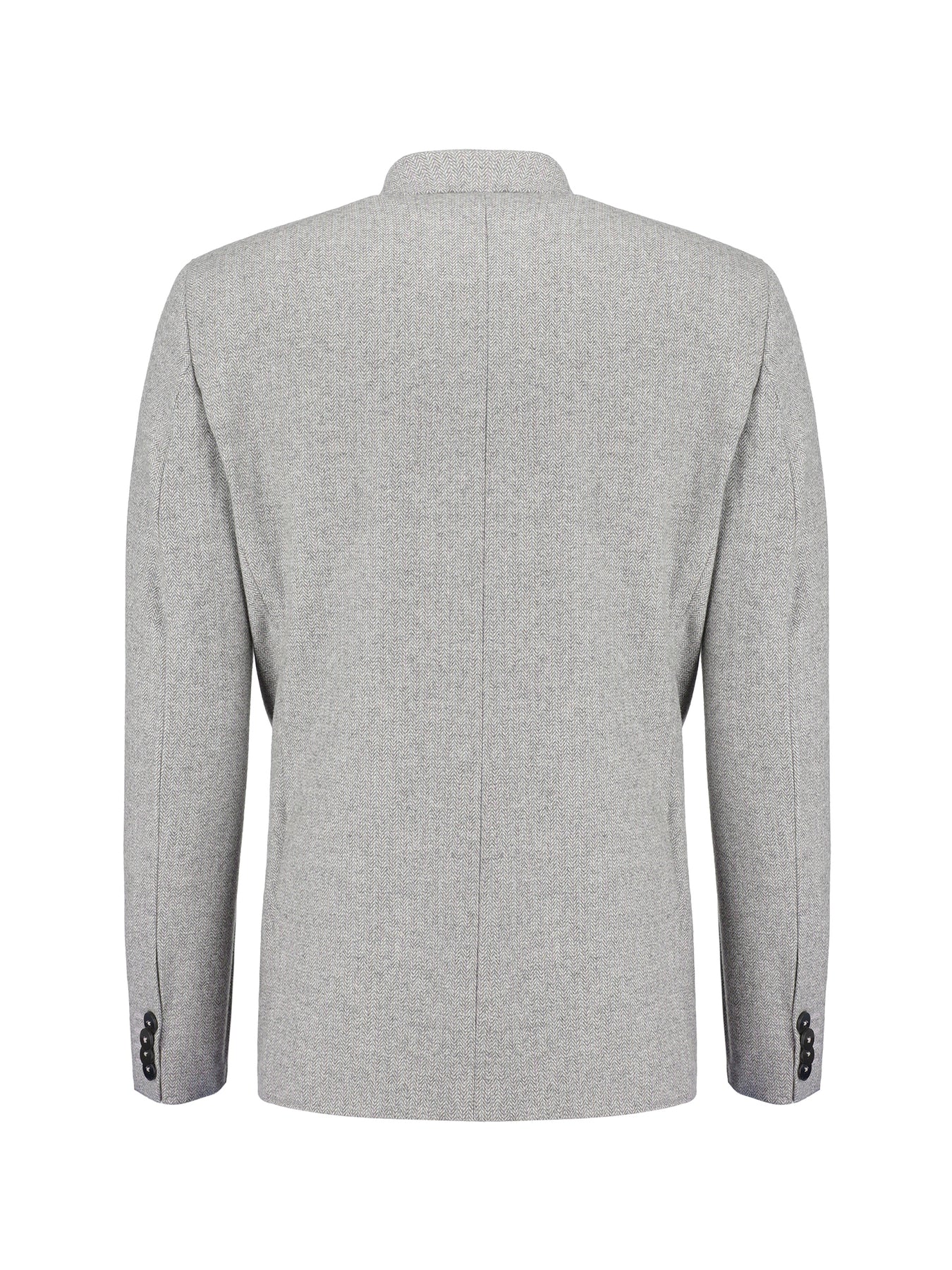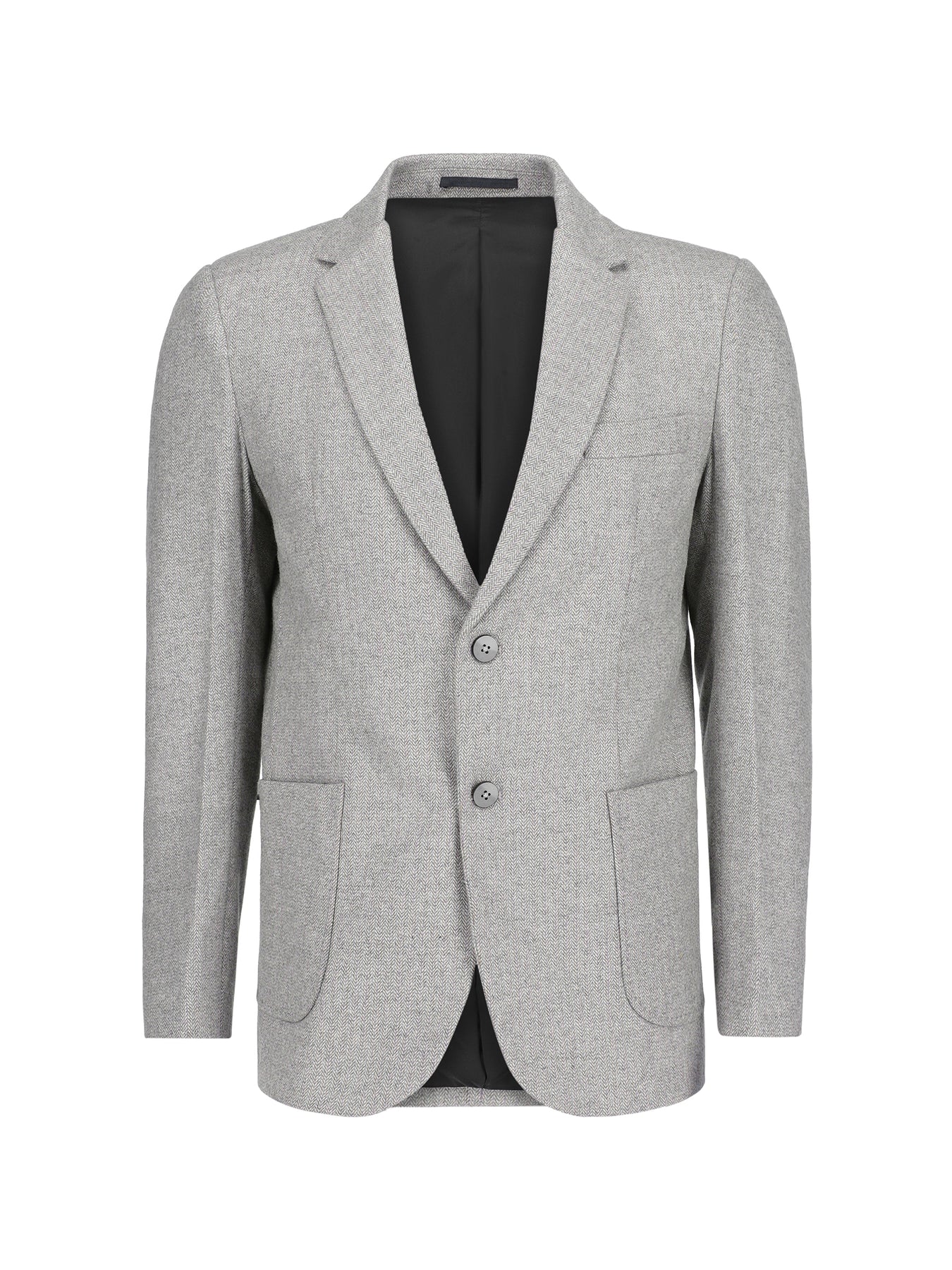 Exclusive light grey herringbone structured wool blended blazer from 2025 Collection. Single-breasted jacket with patch pockets carefully cut in high-end wool blended fabric. Designed for man who appreciates well tailored jacket. Finished in smart casual fit