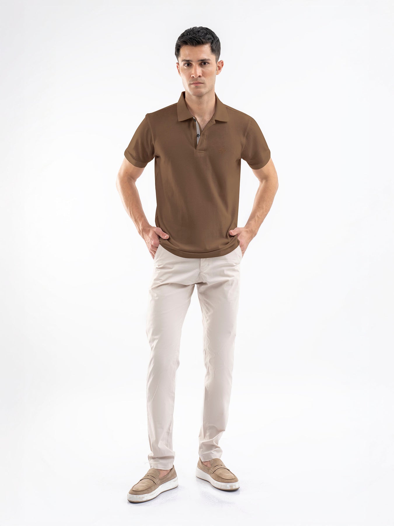 Upgrade your casual wardrobe with our mens mid brown pique polo, crafted from 100% combed cotton for ultimate comfort. This versatile polo offers a timeless look with a rich mid-brown hue, perfect for any occasion. Finished with ribbed collar & jacquard patterned front placket