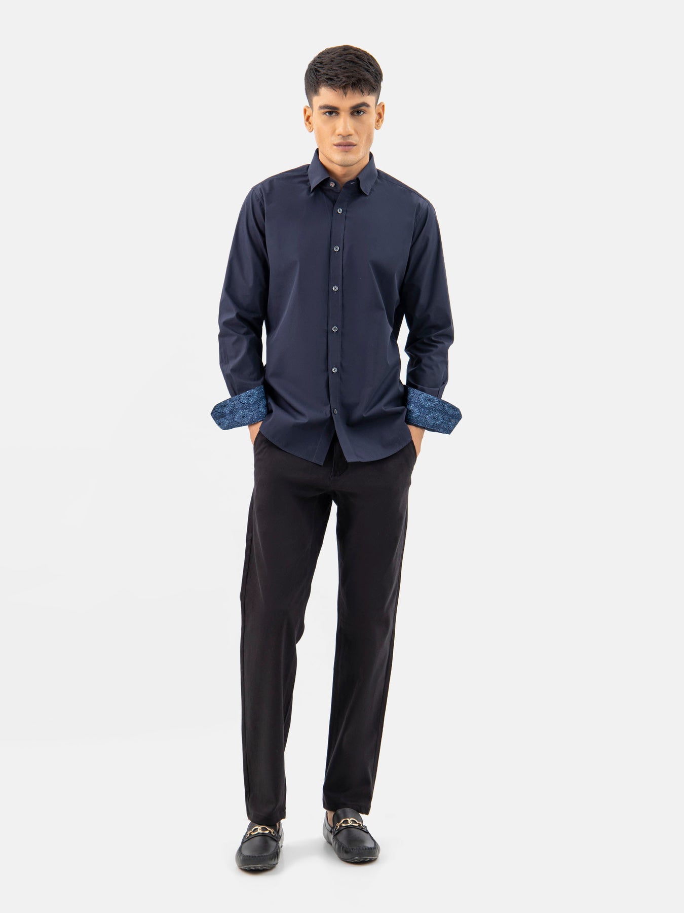 Step into timeless elegance with our mens navy blue satin formal shirt with detailing. This shirt features inside button down collar & printed inner collar detailing weight shirt ensuring a polished and sophisticated look for any occasion. Wear it with our black chinos for a polished look