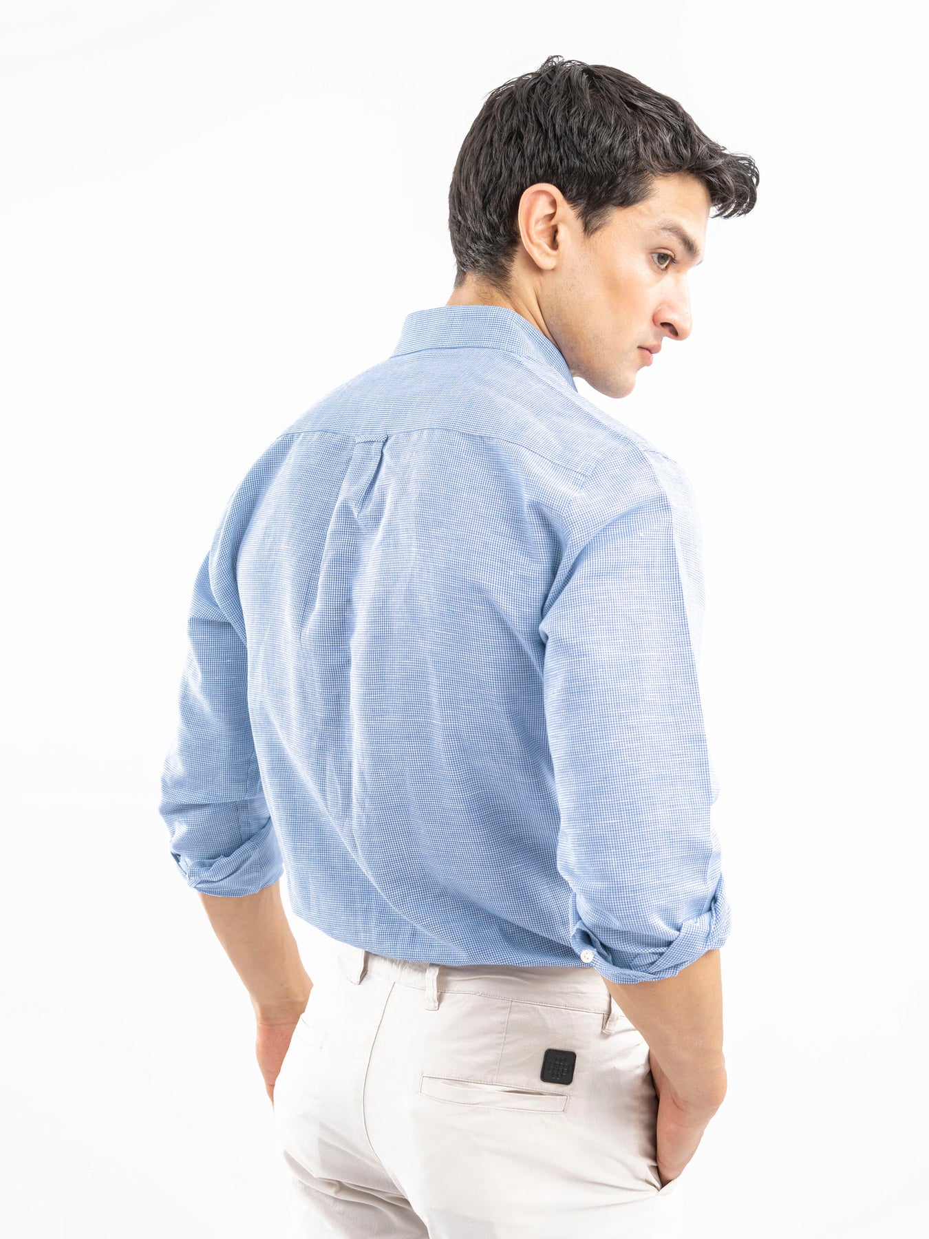 Stay sharp and cool in this sky blue houndstooth patterned linen shirt. Crafted from breathable linen, it features a classic houndstooth design in refreshing blue tones. Finished with button down collar & front inner placket detailing. Perfect for effortless style in warmer weather.