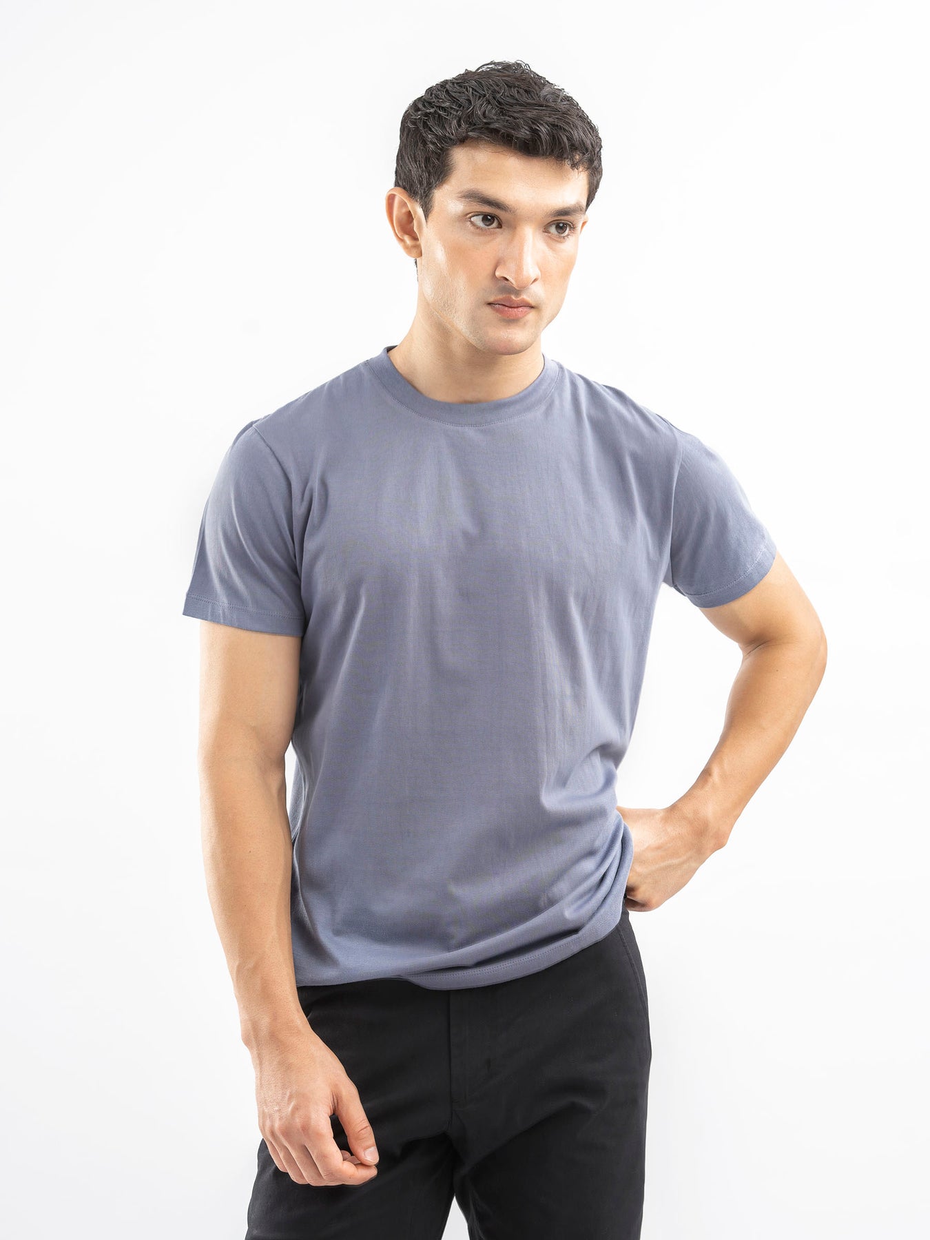 Keep it casual with this greyish blue 100% cotton basic tee. Soft, breathable, and lightweight, this everyday essential offers all-day comfort and a timeless fit. Perfect for layering or wearing on its own.