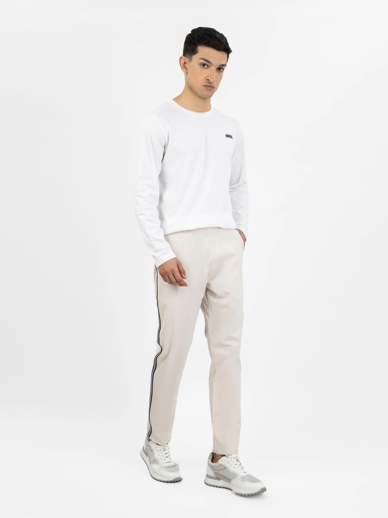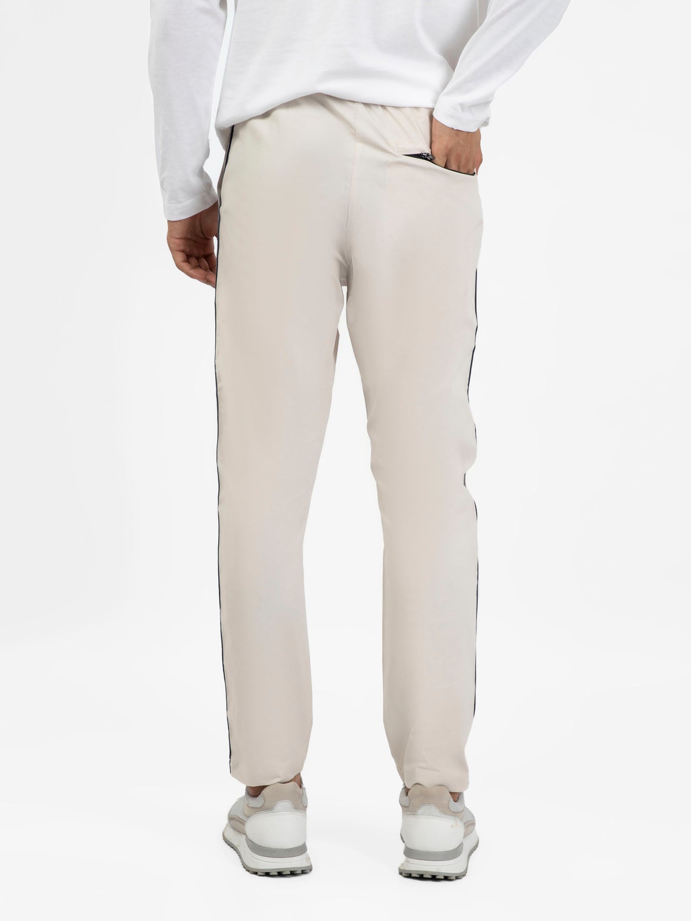 Introducing our new beige pajama made with cotton fabric with added stretch for comfort. An ideal pick for lounging or traveling, it features grey detailing on sides to elevate your look. Soft handfeel, two side pockets and back pocket with zip to ensure safety for your valuables. Ideal for everyday use