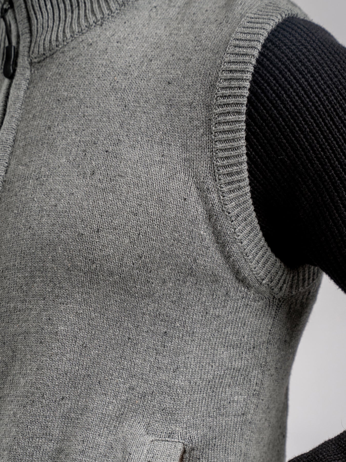 A modern layering essential, this sleeveless zipper sweater is crafted in soft grey neppy knit for a textured look. Featuring a sleek front zip with mock neck, ribbed trims & ribbed hem. Perfect for versatile styling—whether worn over a shirt for a smart touch or paired casually with shalwar kameez