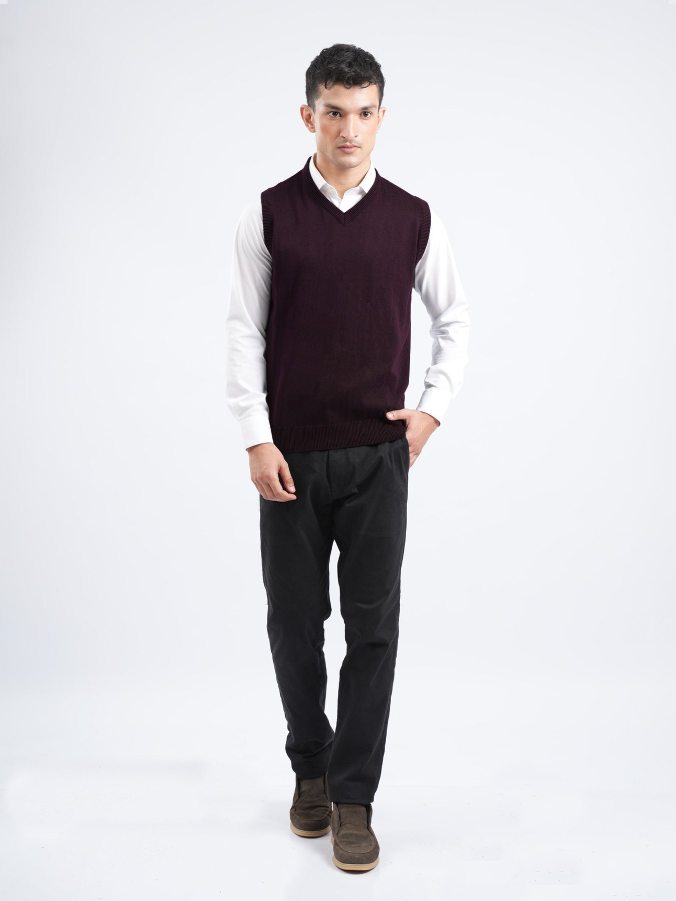 A timeless layering essential, this maroon sleeveless v-neck sweater offers a sleek and versatile look. Light in weight, its perfect for pairing over shalwar kameez or under blazers, it brings comfort and refined style to both casual and formal outfits.