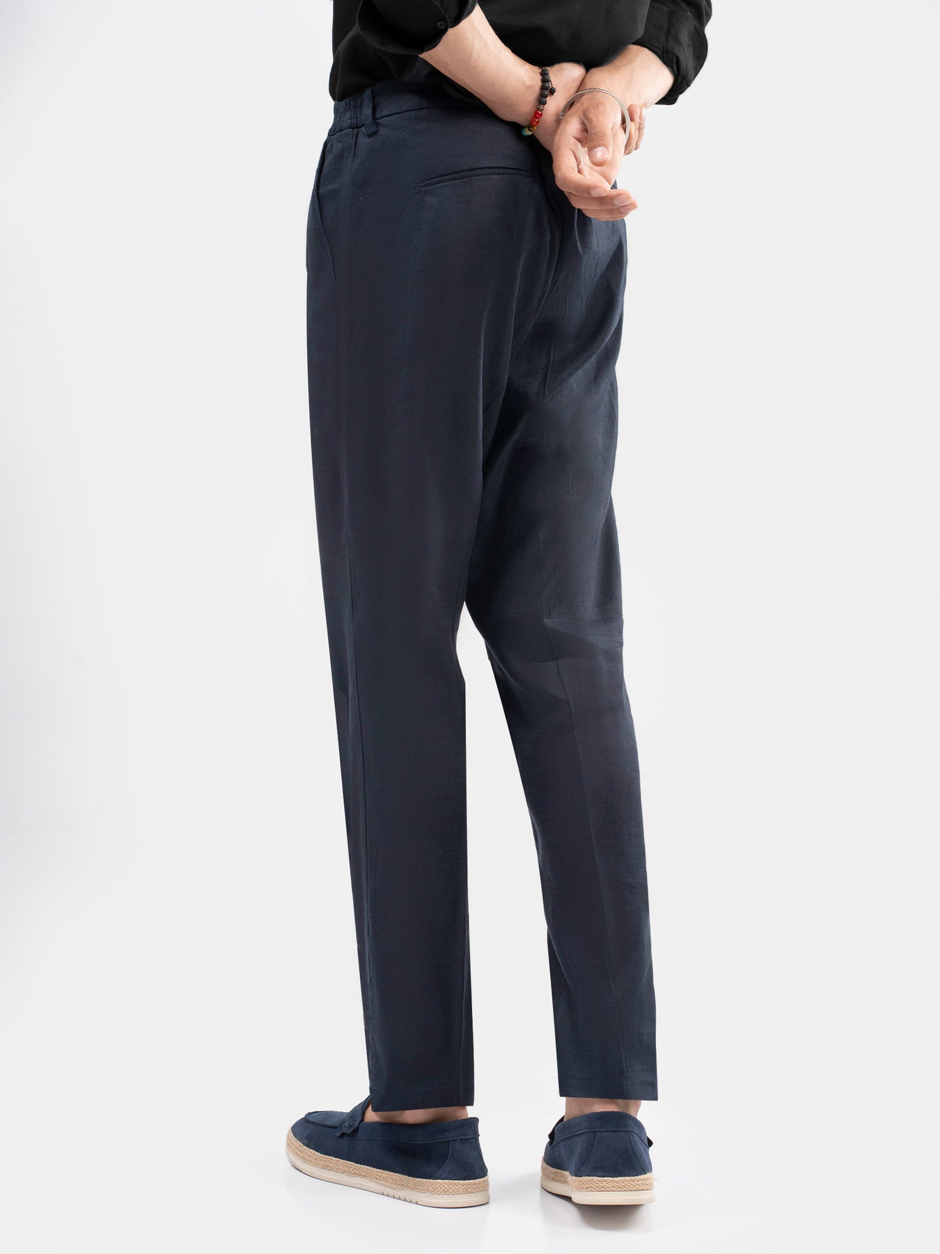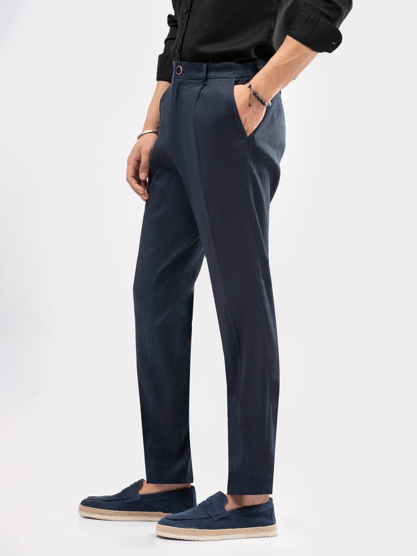 Tailored for effortless comfort, these navy blue linen chinos feature a breathable lightweight feel & front darts for a smart look. Designed with a flexible comfort waistband on side, they move with you from workdays to weekends. Pair easily with polos, shirts, or lightweight layers for a refined summer look.