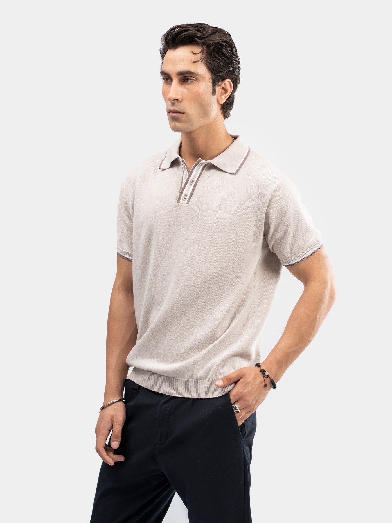 A smart casual essential, this beige flat knit polo features a contrasting placket with tipped collar and sleeves for a refined look. Made from comfortable flat knitted fabric, it pairs easily with chinos or denim for effortless everyday style.