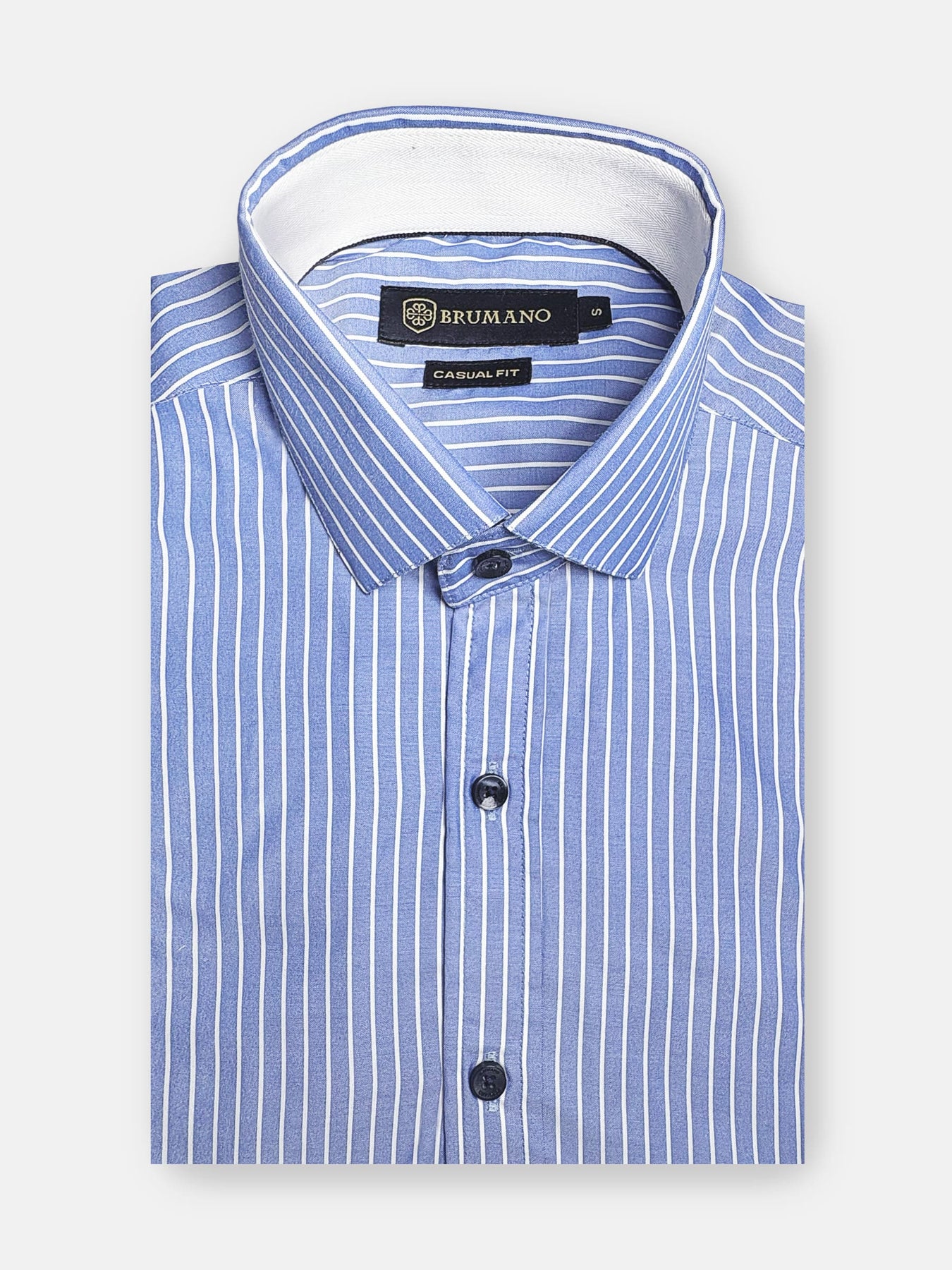 Introducing our mens navy blue striped shirt In super light weight fabric. A summer staple for effortless style, this shirt features shallow collar, making it ideal for office & casual outings. Pair it with navy blue chinos for a dapper look
