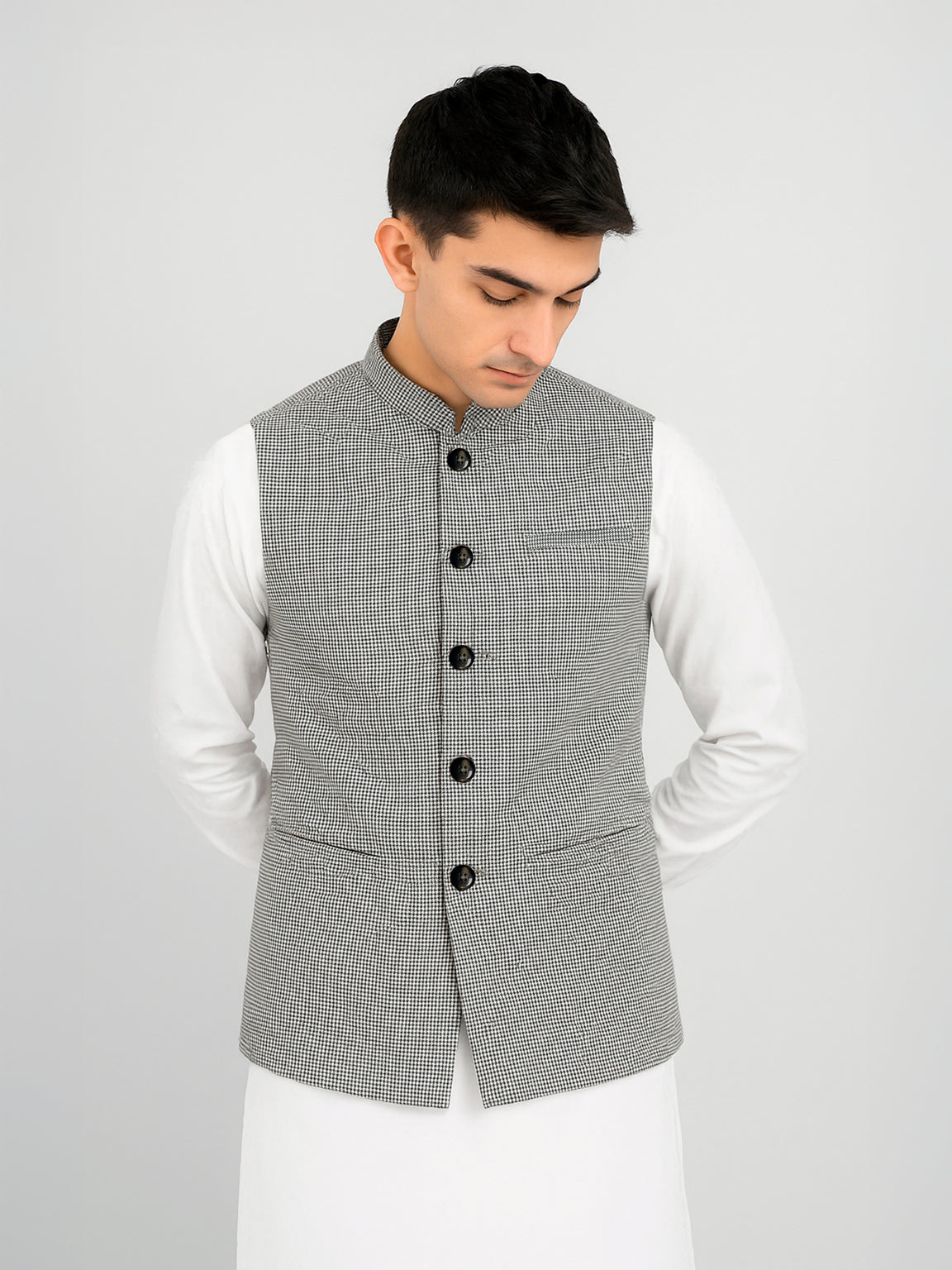 Add timeless charm to your wardrobe with this black & white houndstooth waistcoat. Featuring a classic houndstooth pattern, tailored fit, and sharp silhouette, it's perfect for layering over shirts or under blazers for a polished, vintage-inspired look.