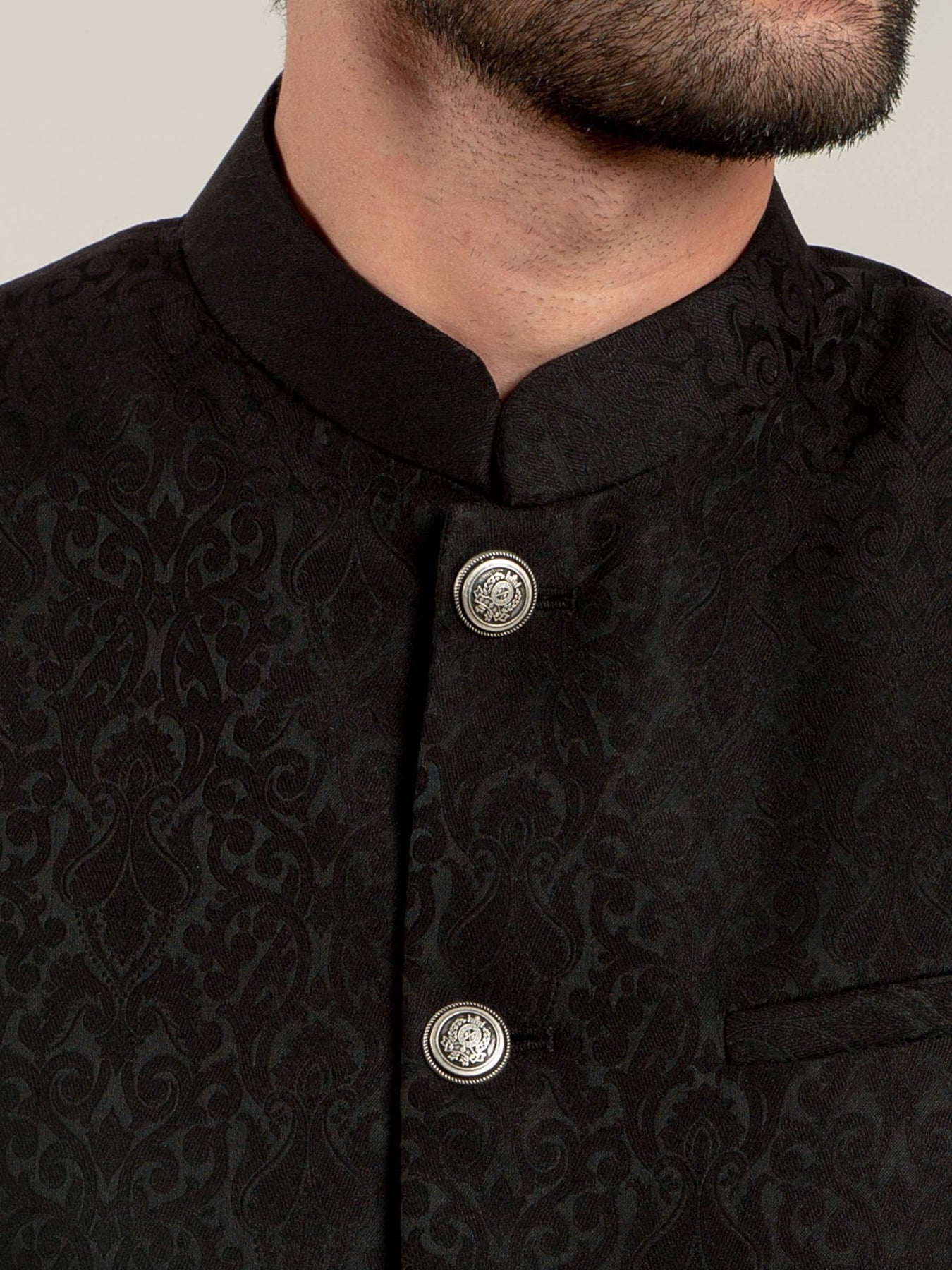 This black jacquard waistcoat is made with cotton blended fabric weaved together with jacquard pattern for a festive look. Featuring silver metal buttons with concealed pockets. Ideal for weddings