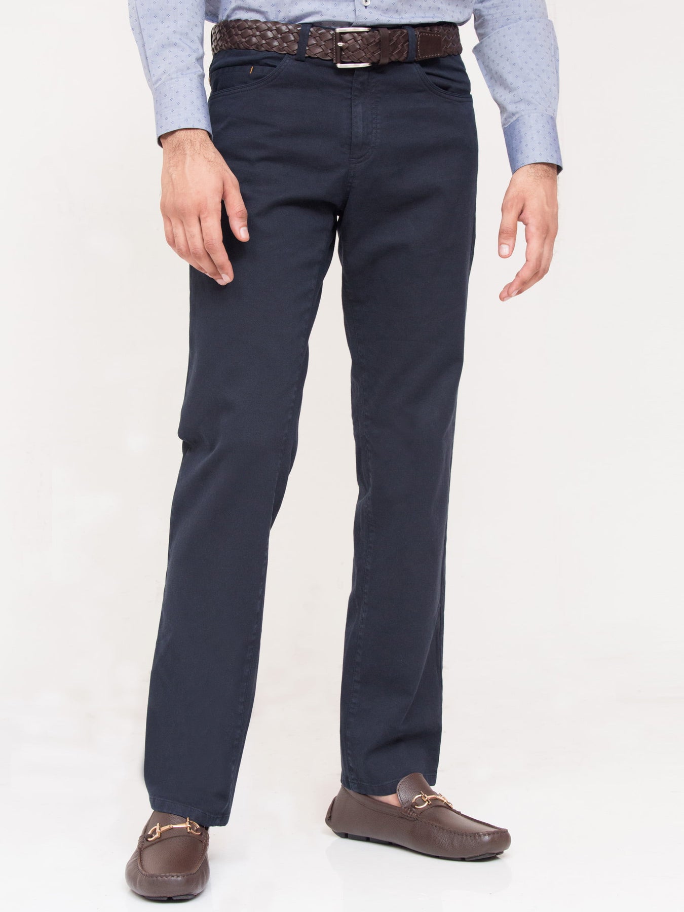 Classic five pocket trouser in navy blue color & unique details. This style is cut in structured cotton fabric with a small amount of stretch that give these trousers extra ease and comfort.